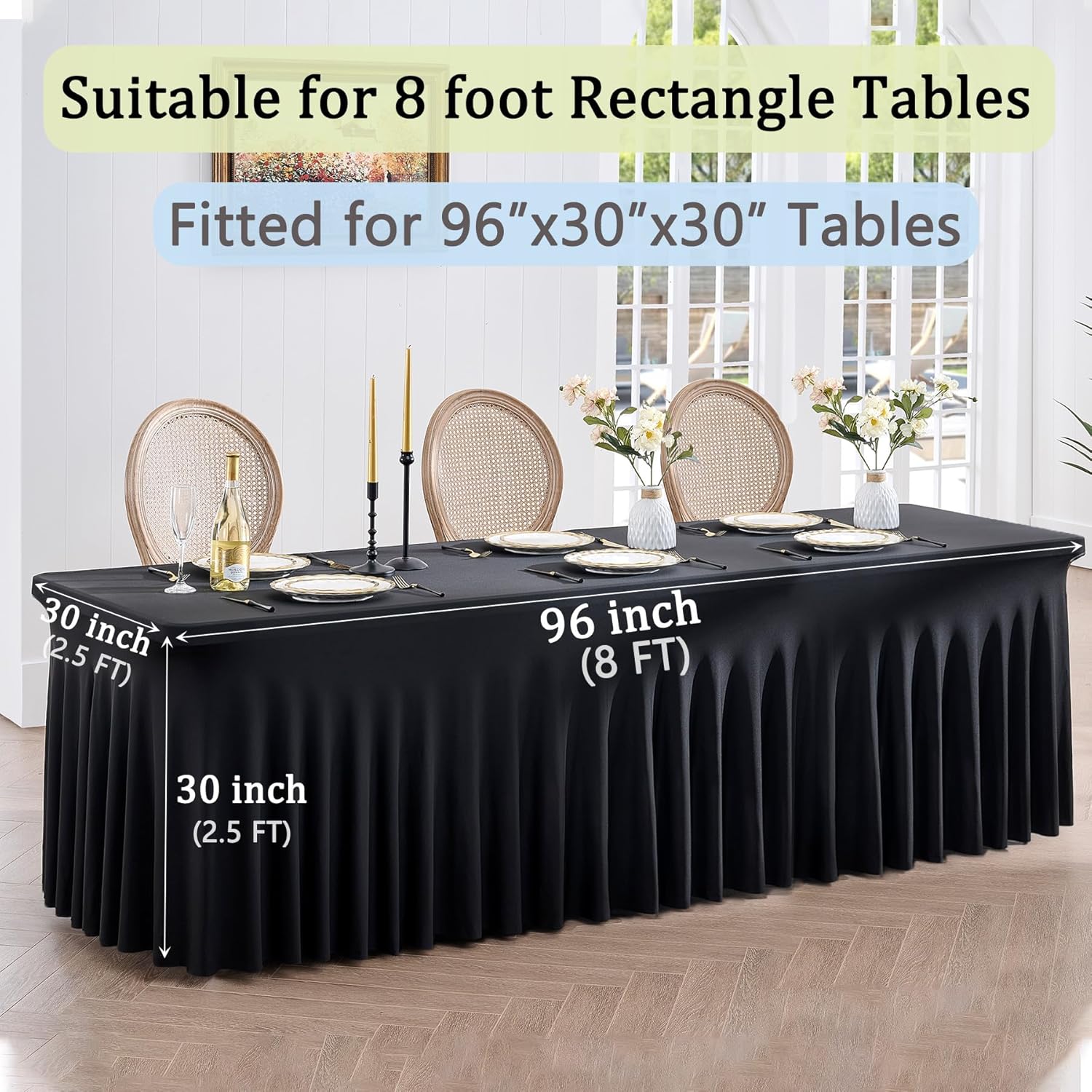 - 1. You will receive 8 Pack black wavy spandex tablecloths fitted for 8 foot rectangle tables. Manteles de mesa de tela para fiestas.