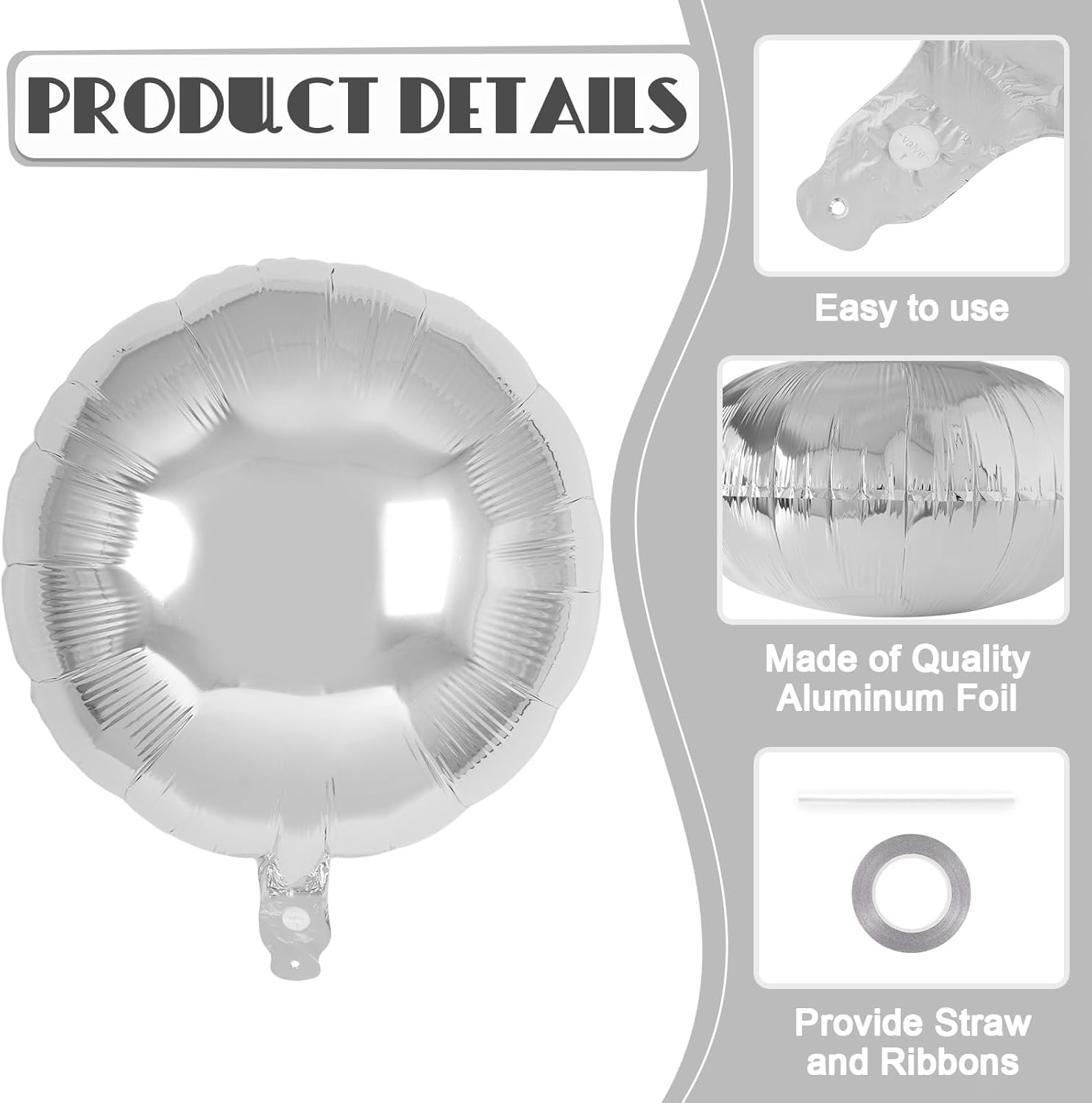 - Included Components : 20 Pcs Round Foil Balloons, 1 Roll of Silver Ribbon, and Straw