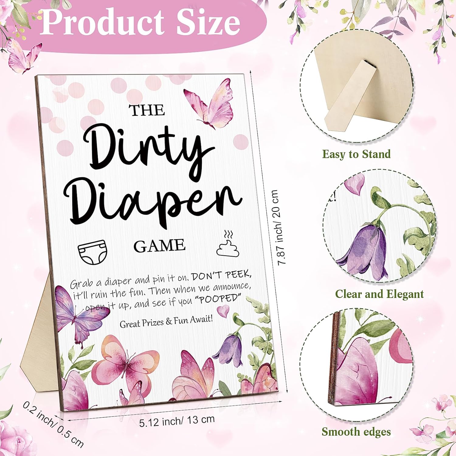 - Creative Design: the baby shower game sign for girl is decorated with butterflies, elegant and attractive, which can bring more color to your party, printed with explainable words on the surface, allowing you to understand how to play this funny game at once