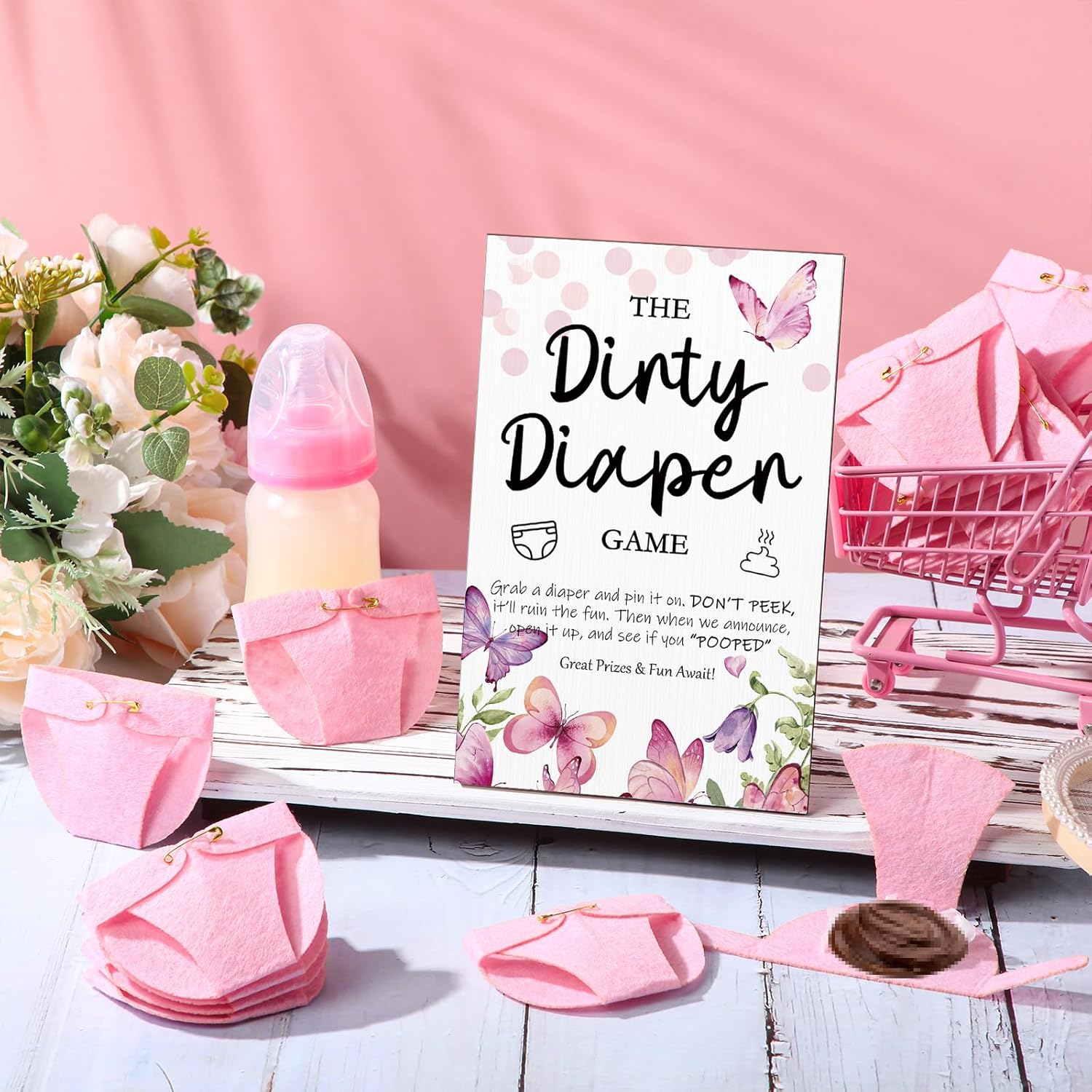 Roowest 51 Pcs Dirty Diaper Baby Shower Games Funny Wooden Sign with 50 Pcs Mini Diapers Cute Felt for Gender Reveal Party Baby Shower(Pink Butterfly)