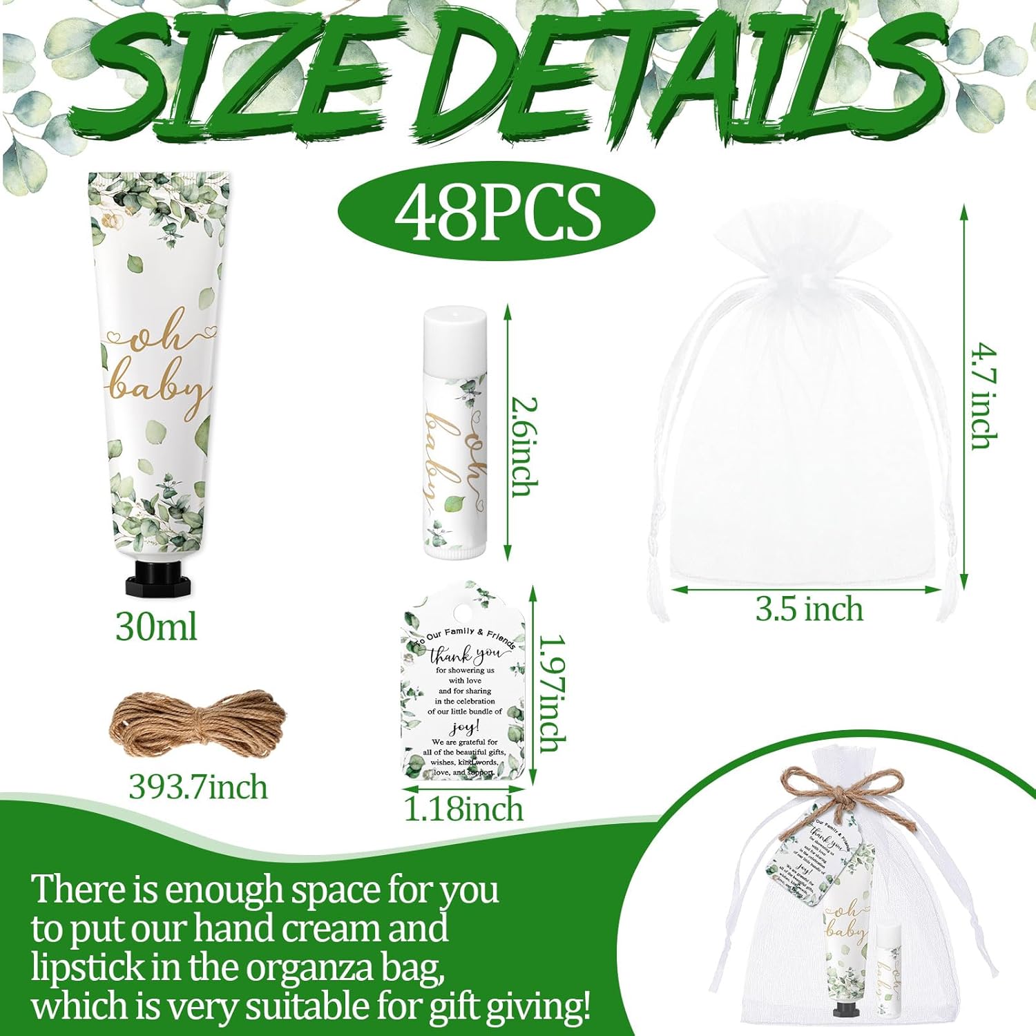 - Elegant Design: each hand cream and lipstick has eucalyptus leaf pattern and 'oh baby' character design, which is exquisite and elegant, improves the gift giving atmosphere, and can bring you a positive mood; This charming and lovely gift adds a touch of elegance and unexpected joy to most baby shower decorations, whether it's for boys or girls; This is an ideal souvenir for baby showers