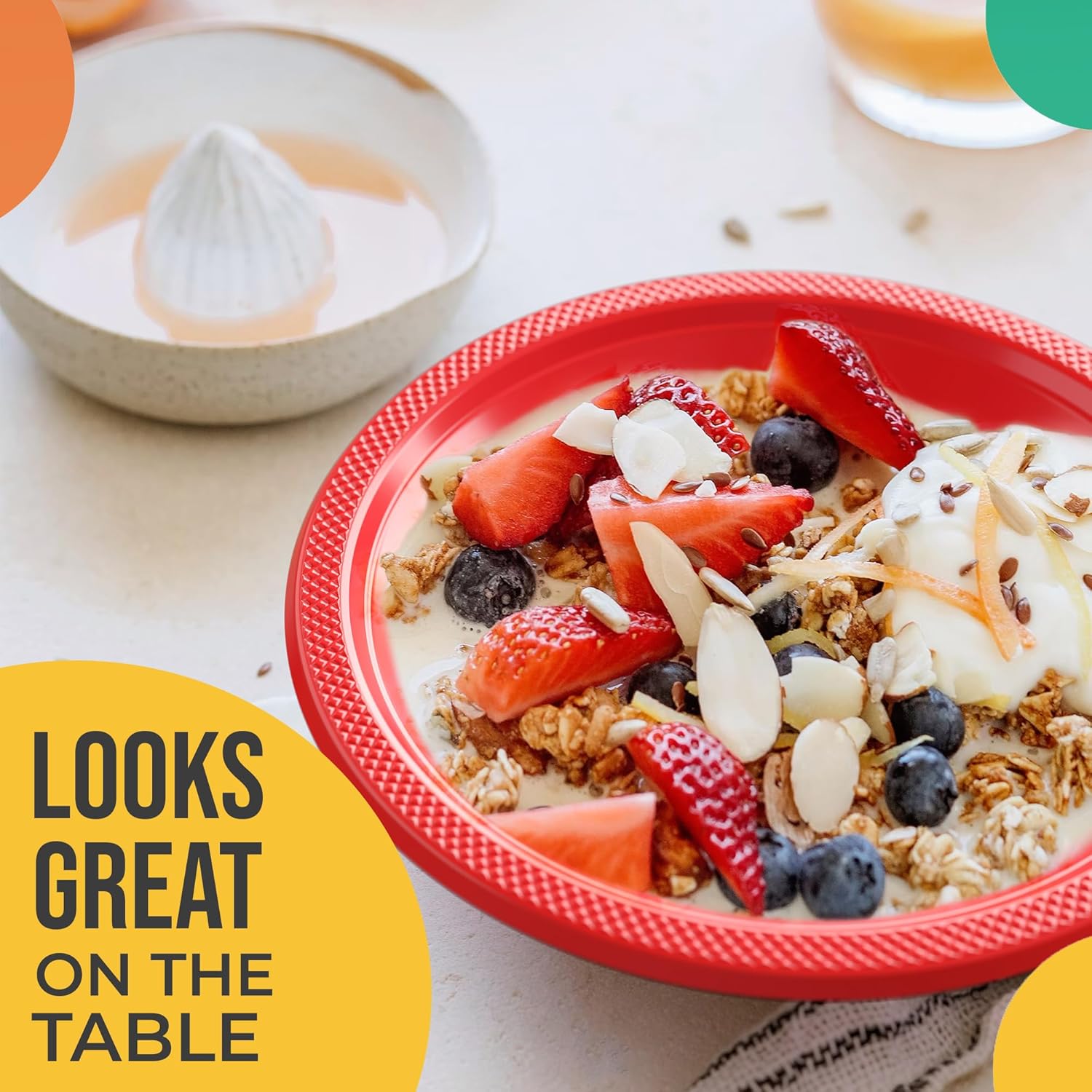 - What's Included: These Exquisite 100 Pack of 12 oz Red plastic bowls are designed with a large capacity to accommodate generous portions. Measuring 7 inches wide and 2 inches tall they are Ideal for serving all food types at meals and parties and they also function as excellent plastic cereal bowls or Red disposable bowls for hot soup