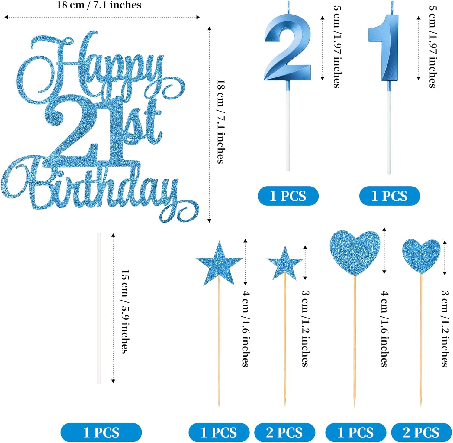 - Package content: you will receive 1 piece happy 21st birthday topper, 3 pieces star cake toppers, 3 pieces heart cake toppers and 2 pieces numeral candles, it's a great addition to the 21st birthday party and anniversary party