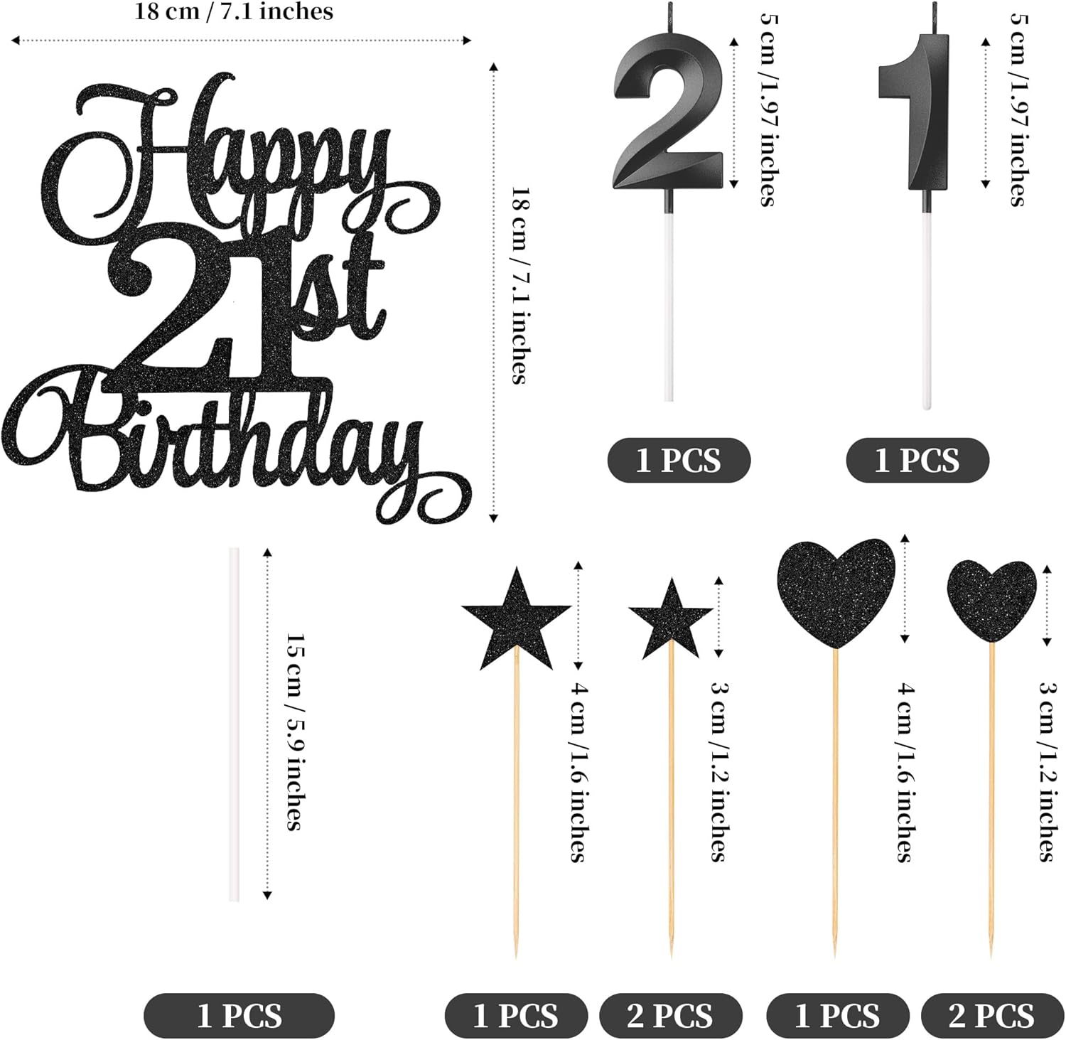 - Package content: you will receive 1 piece happy 21st birthday topper, 3 pieces star cake toppers, 3 pieces heart cake toppers and 2 pieces numeral candles, it's a great addition to the 21st birthday party and anniversary party