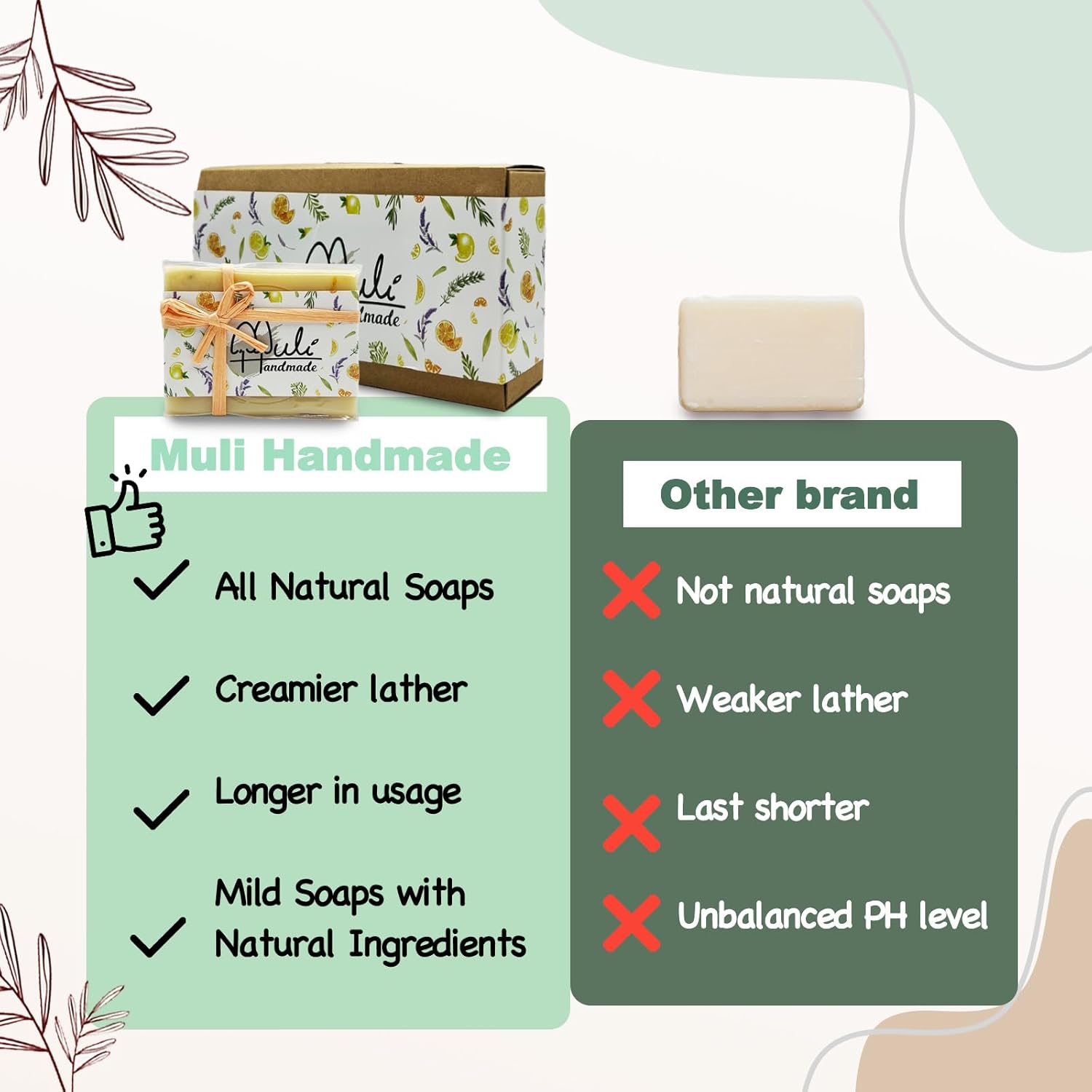 - Crafted with Care: Muli Handmade Soap is the result of a couple's dedication to quality and skin health. Backed by a commitment to natural ingredients, pleasant scents, and sustainable practices, our soap bars bring the essence of handmade luxury to your daily routine. Experience the difference today! Great packaged gift design for anniversary, Valentine’s Day, Mother’s Day, Birthday, Christmas, and other occasions!