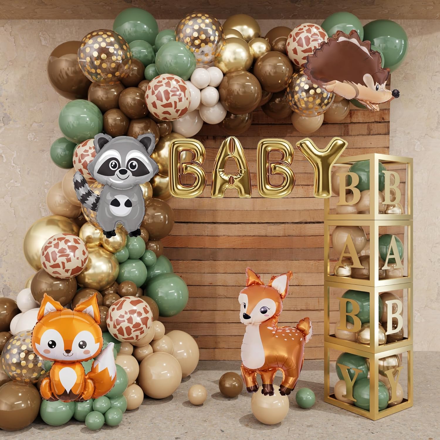 Amandir 137pcs Woodland Animals Baby Shower Decoration Baby Boxes Sage Green Brown Balloon Garland Arch Kit Woodland Themed Animal Foil Balloons for Neutral Forest Jungle Safari Party Supplies