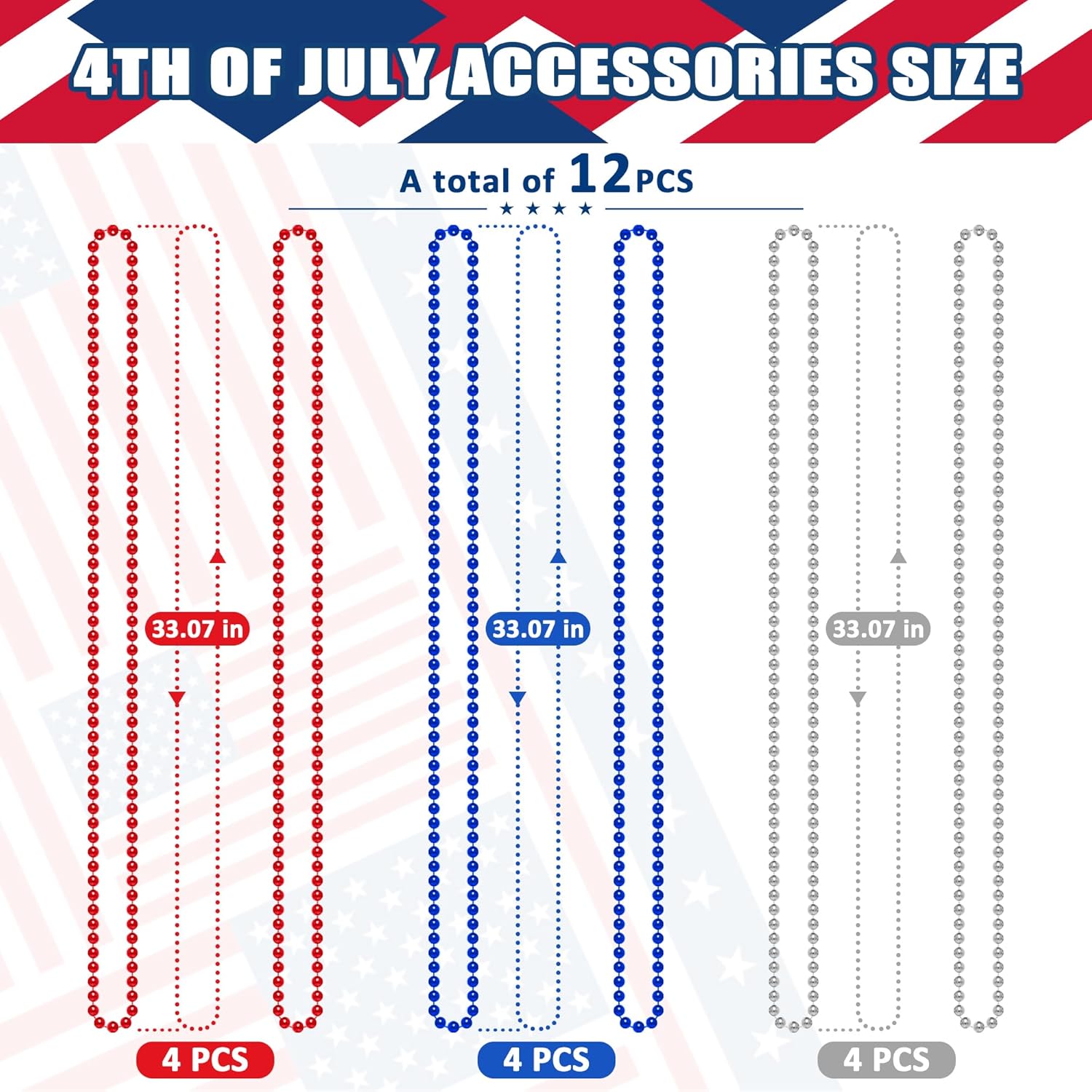 4th of July Party Favors, 12PCS Veterans Day Necklaces Bulk, Fourth of July Red Blue Silver Beads Necklace, Veterans Day Patriotic Beads Bulk for Parade Party Celebration Favors Decorations