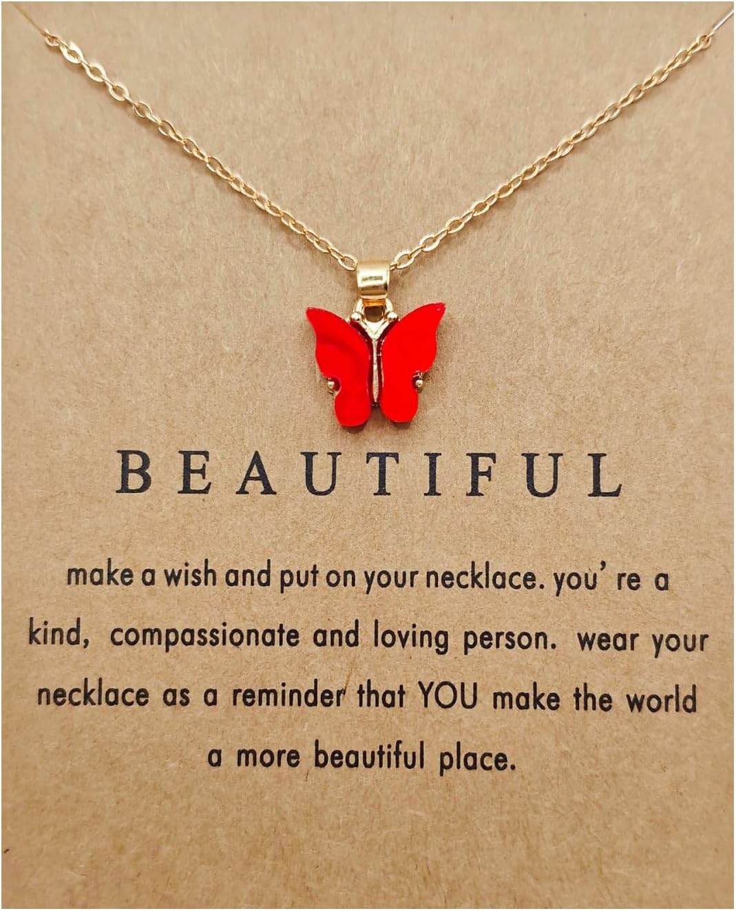 - Cute Butterfly Necklace:There have nine colors,black,white,Sapphire blue,pink,rose red,light blue,red,green and yellow,each butterfly necklace comes complete with a greeting card,which makes it stands out among all other plain necklaces