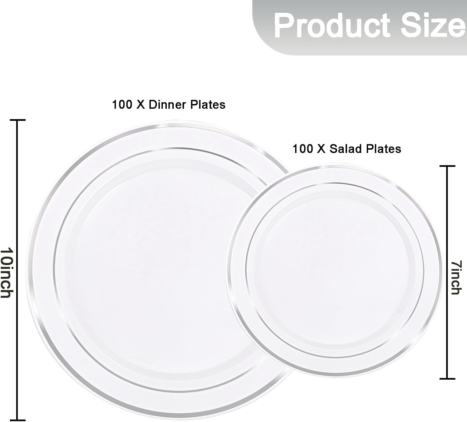 - Ideal for Any Occasions: This pair of silver disposable plates are suitable for dinner,dessert,salad,cake and appetizer. The disposable wedding plates are sufficient for 100 guests, also perfecting for parties, birthday, weddings, Thanksgiving, Christmas and others any occasions.