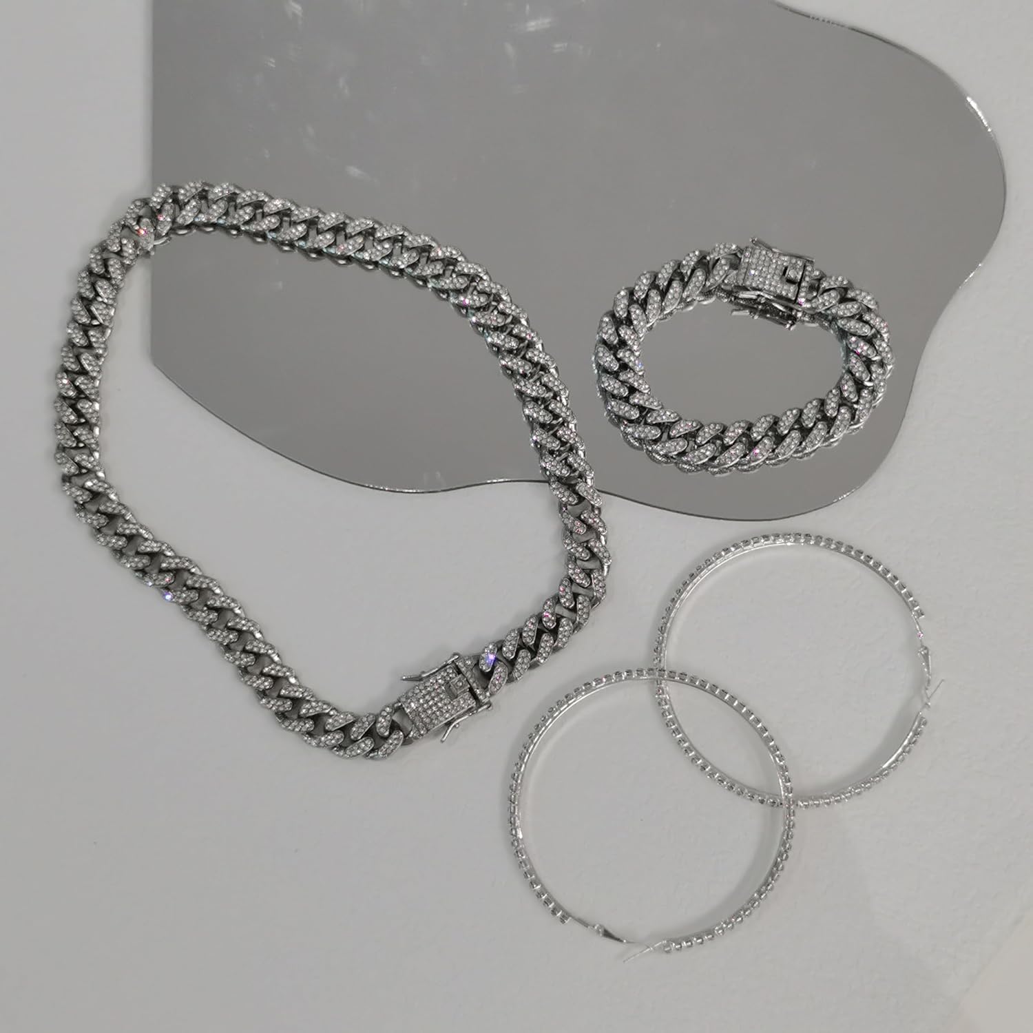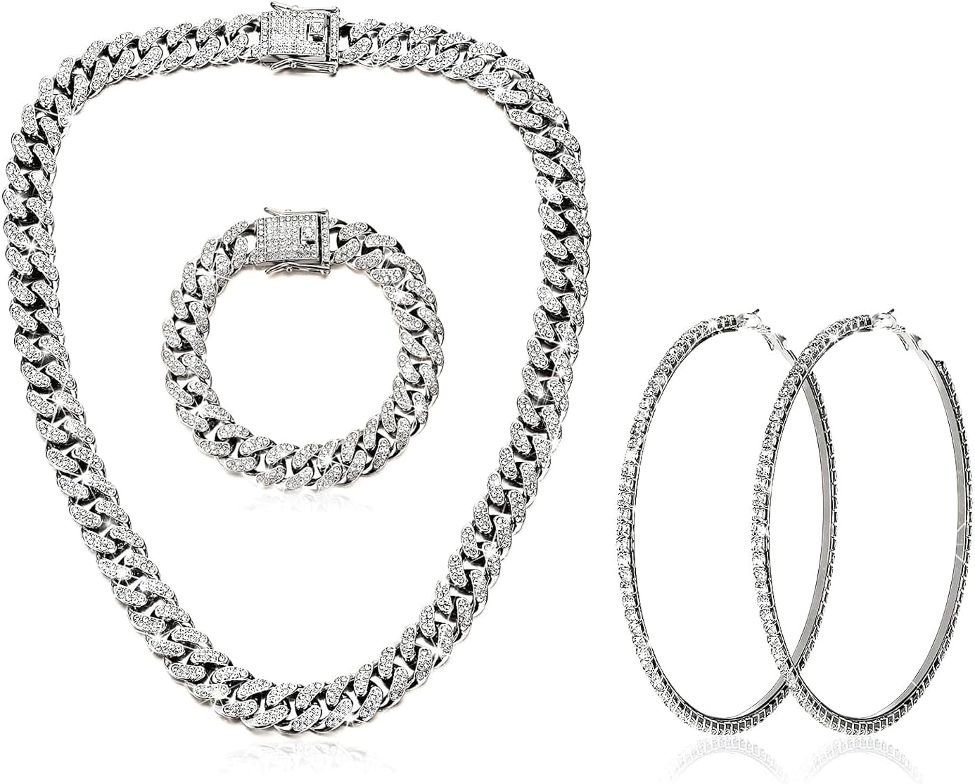 - Appropriate Sizing: The bracelet measures approximately 7"/18cm in length, while the necklace spans about 18"/44cm, making them suitable for most wearers. Both the necklace and bracelet boast a width of 0.47"/12mm. The hoop earrings feature an diameter of 3"/7.5cm, with the diamonds measuring 0.11"/2.8mm in width. These elegant accessories not only complement various outfits but also serve as powerful adornments to uplift you during moments of distress.