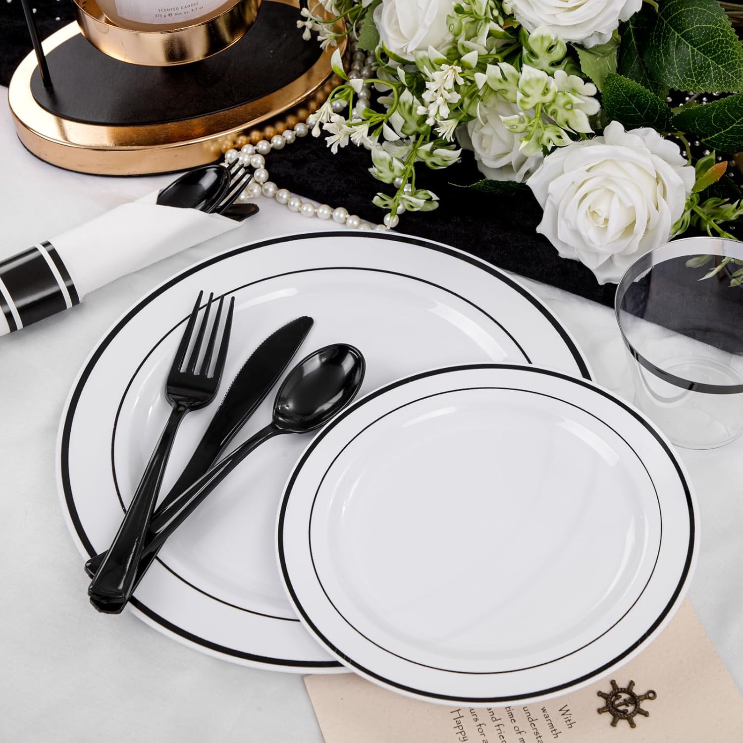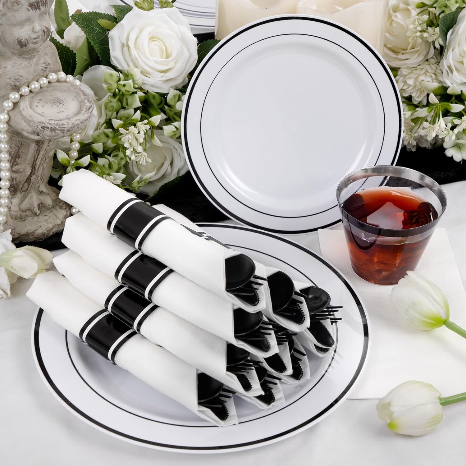 WELLIFE 350Pcs Black Plastic Dinnerware with Pre Rolled Napkins, Include:50 Dinner Plates, 50 Dessert Plates, 50 Paper Napkins, 50 Cups, 150 Plastic Cutlery