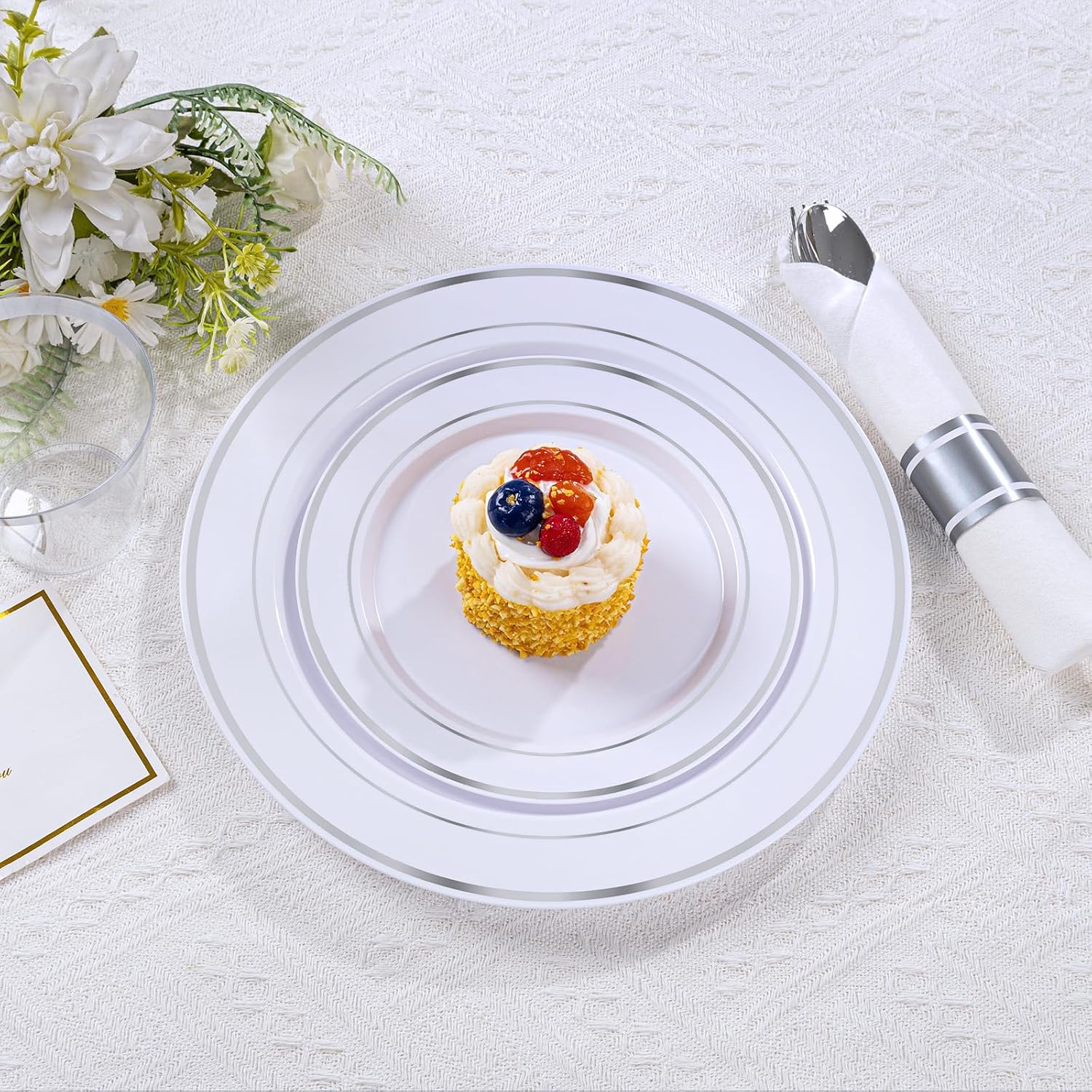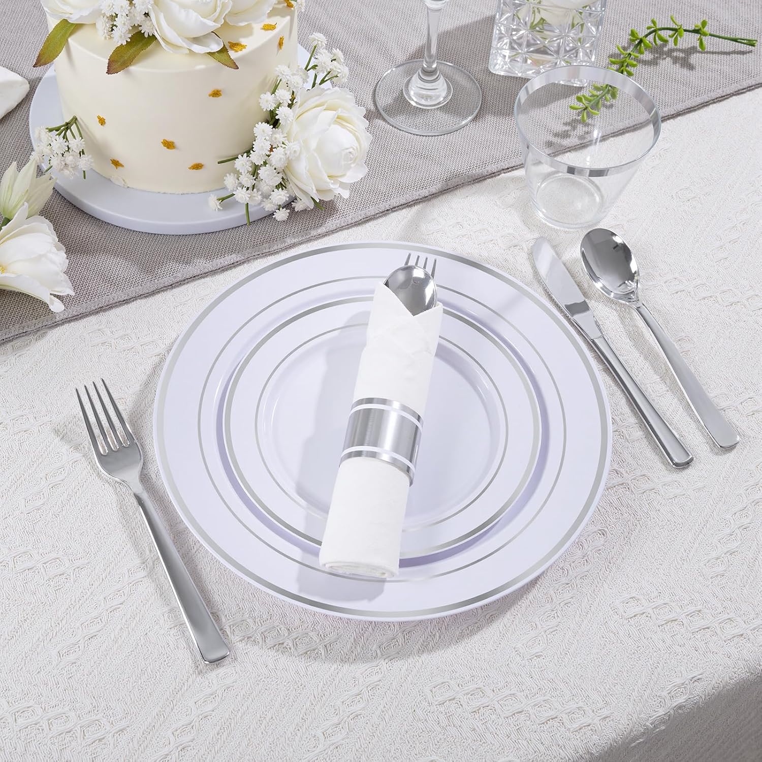 - ELEGANT DESIGN - With classic white plates adorned with timeless silver rims, these disposable plates and silver silverware sets effortlessly integrate into any event, resembling authentic ceramic plates. They exude a classic, timeless aura that helps create cherished memories for guests.