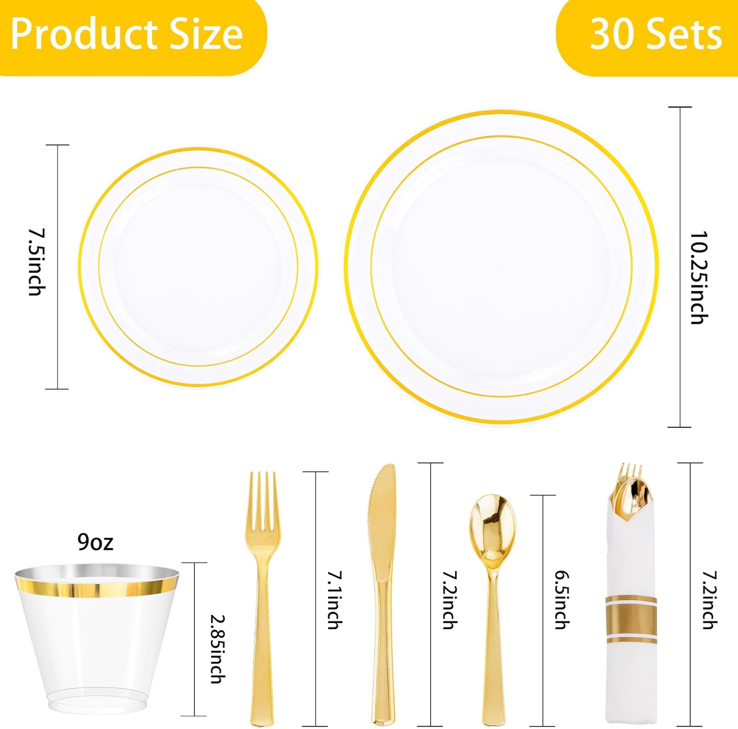 - PERFECT DIMENSIONS - Seamlessly fitting into every occasion, this exceptional party plate set is the perfect choice. This package includes 30 dinner plates measuring 10.25 inches, 30 salad plates at 7.5 inches, 30 sets of pre-rolled napkins with gold silverware, and 30 cups at 9 oz.