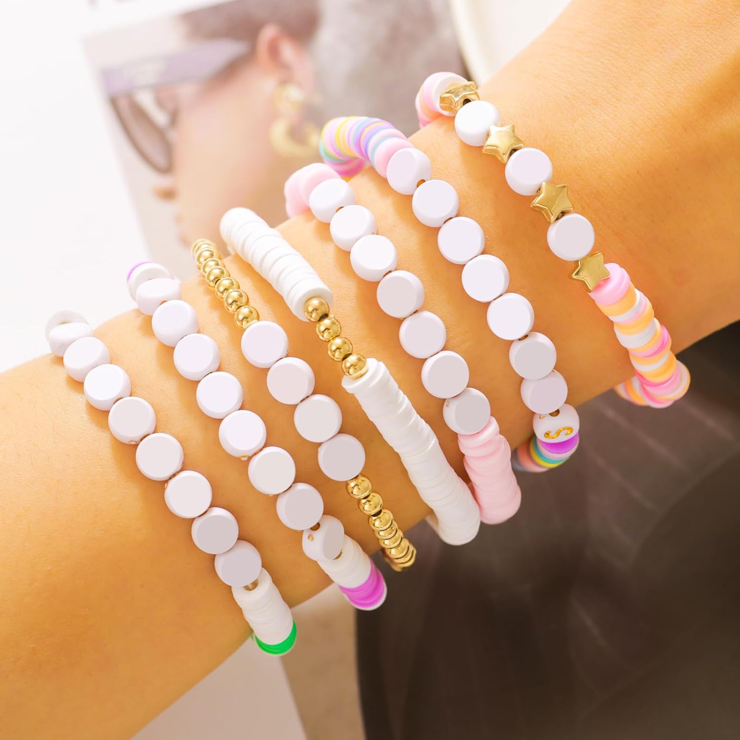 - Heishi Surfer Bracelets Set - For beach jewelry, aesthetic stuff Bracelets Jewelry we love a mix color of effortless layering bracelets. Bold and vibrant, the Bohemia bracelets are consist of flat clay beads and gold plated sequins on elastic bands.One package including 16 strands of heishi bead and gold bead bracelet, playful, colorful and stretch.