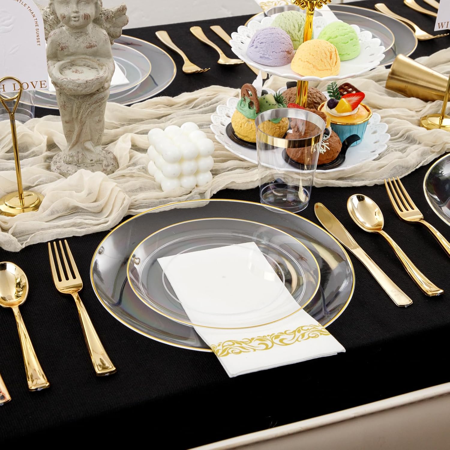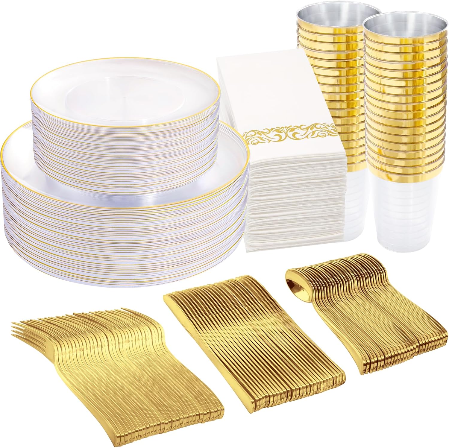 Supernal 350PCS Clear and Gold Plastic Dinnerware Set Include Clear Disposable Plates, Gold Plastic Silverware Heavy Duty, Cups and Napkins for Birthday, Weddings, Parties