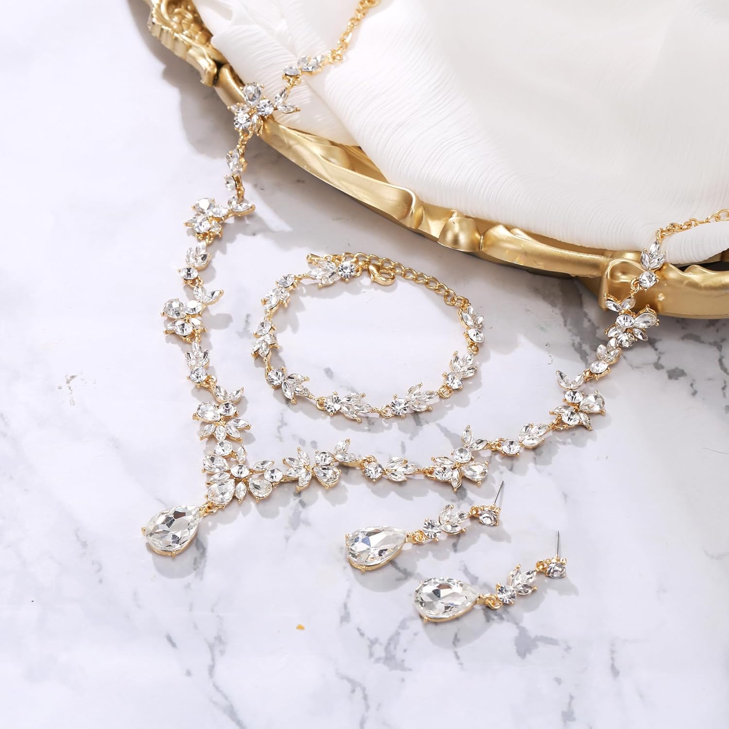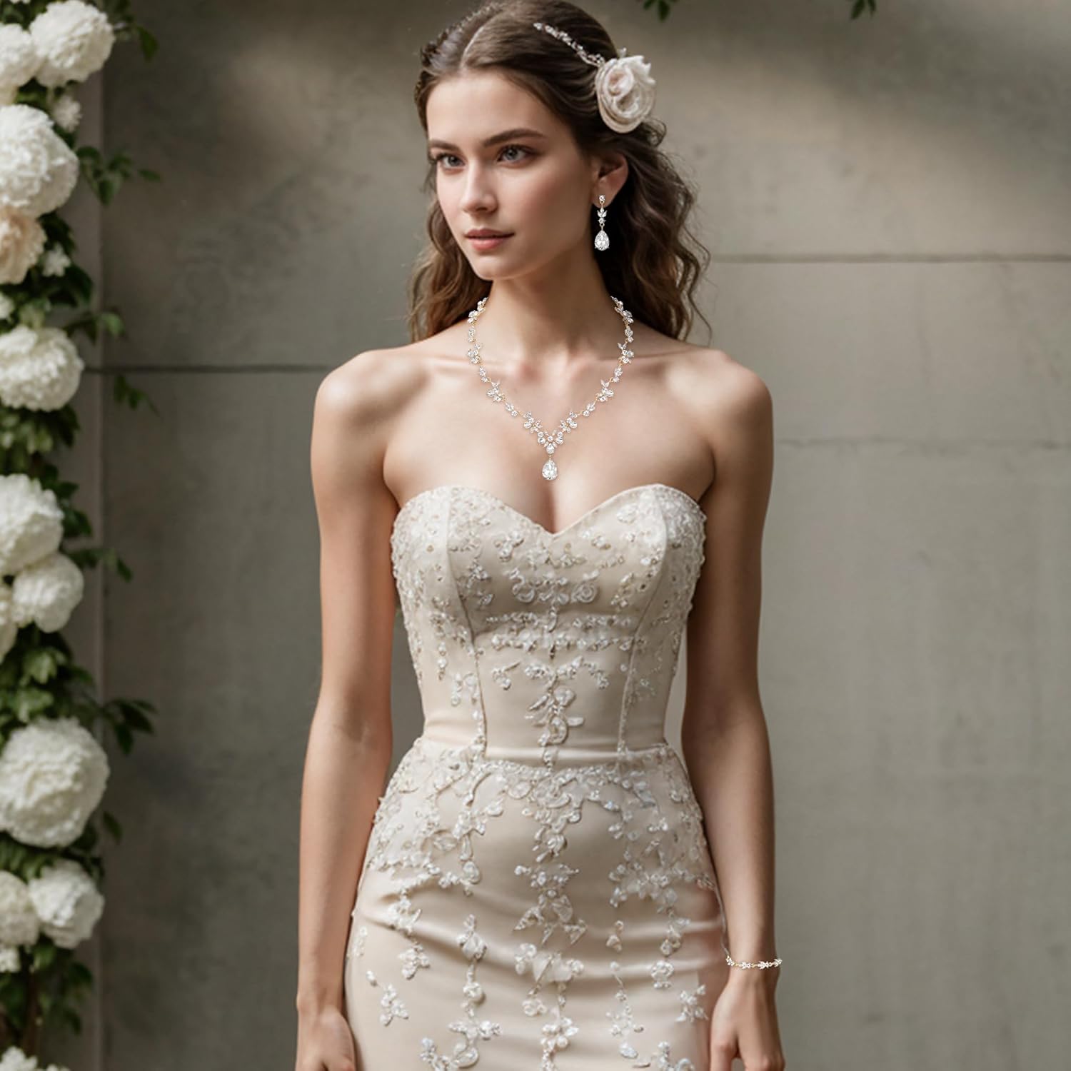 BriLove Wedding Jewelry Set for Women Bride, Y-Necklace Tennis Bracelet Dangle Earrings Crystal Teardrop Marquise Cluster for Bridal Bridesmaid