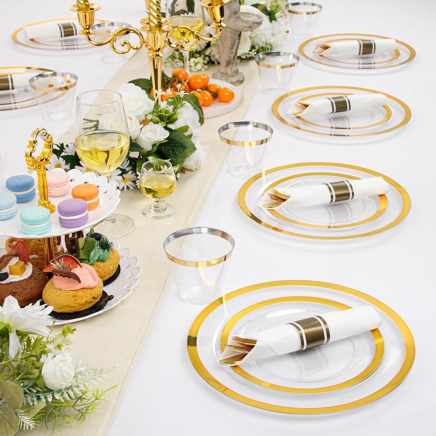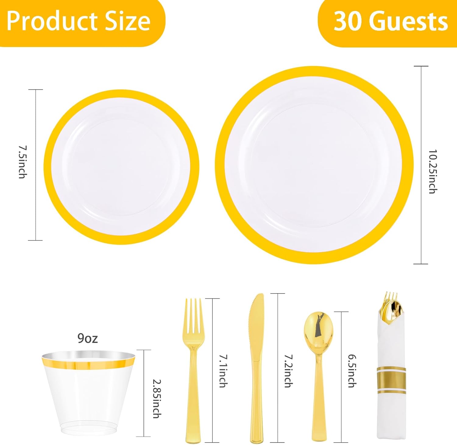 I00000 210 Pcs Clear Plastic Plates,Gold Disposable Plates,Include 30 Dinner Plates 10.25'',30 Dessert Plates 7.5'',30 Gold Rim Cups 30 Pre Rolled Napkins with Plastic Cutlery for Thanksgiving