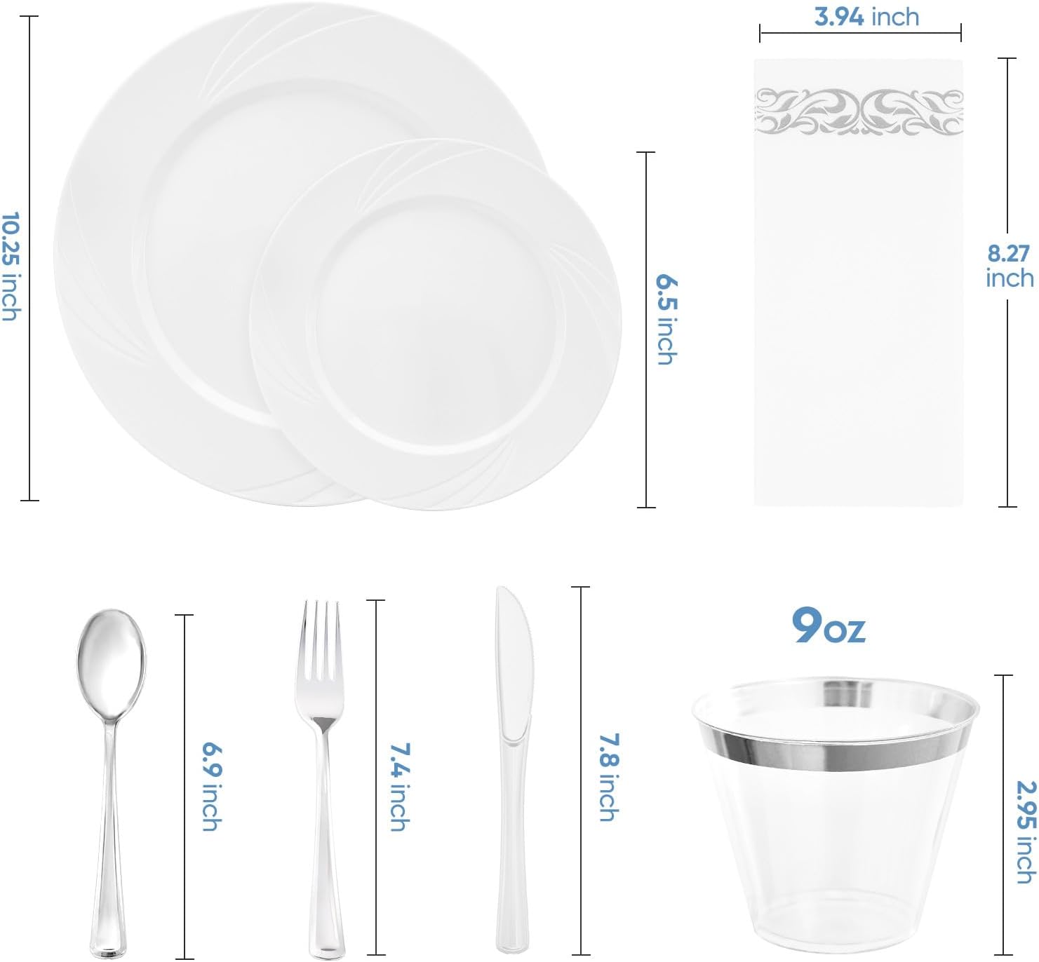 350-Piece White Swirls Plastic Dinnerware Set for 50 Guests, Elegant Disposable Dinnerware for Party, Wedding. Includes 10.25" Dinner Plates, 6.5" Dessert Plates, Silverware, Napkins, Cups