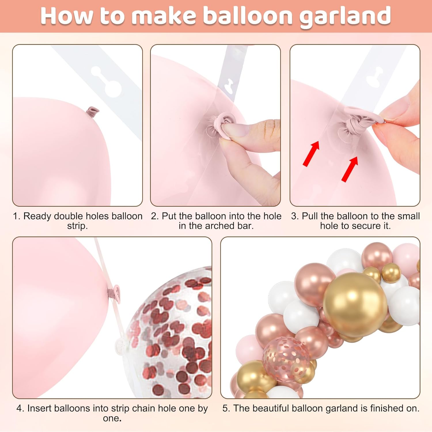 - Easy to Use: Our pink balloon arch comes with balloon accessories which can help you create the perfect rose gold balloon arch; You can make daisies balloons with flower clips; Hooks can help better secure balloons where you need; Design your rose gold balloon garland by inflating the balloons with helium or air, then attach them with balloon strip or ribbon; And you also can use glue points to add small balloons to the garland, allowing you to mix and match different colors for endless styles