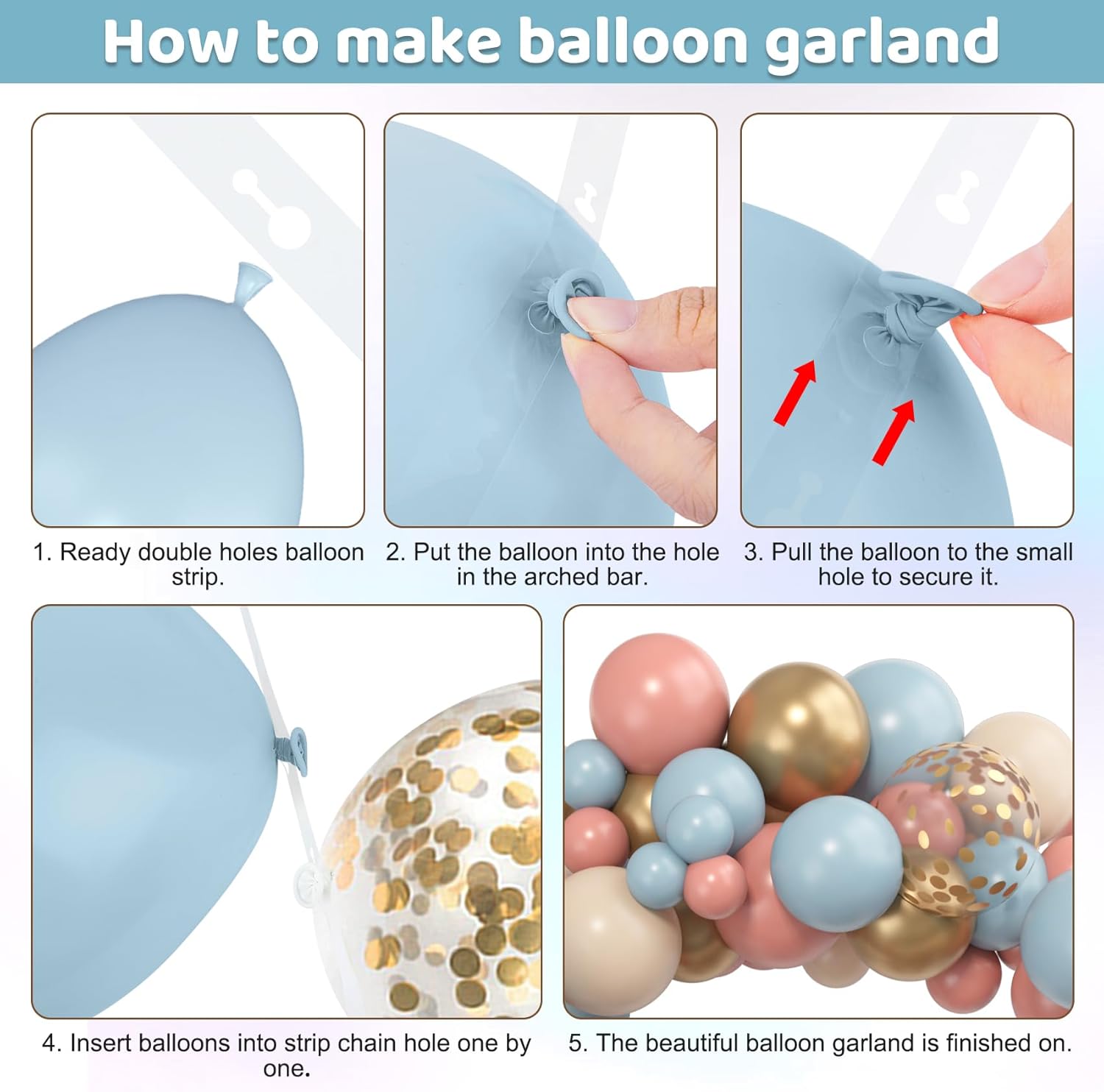 - Sufficient Quantity of Pink and Blue Balloons: The gender reveal balloon arch kit includes 18" dusty pink/dusty blue /nude balloons(3 pcs), 12" dusty pink/dusty blue /nude/metallic gold/ confetti gold balloons(25 pcs), 10" dusty pink/dusty blue /nude/metallic gold balloons(50 pcs), 5" dusty pink/dusty blue /nude/metallic gold balloons (65 pcs), 10pcs balloon tools(balloon arch strips, tying tool, 100 glue points, ribbon, flower balloon clip, hook)