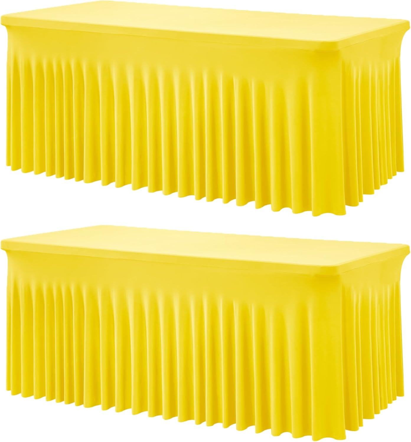 - 1. You will receive 2 Pack yellow wavy spandex table covers fitted for 6 foot rectangle tables. Manteles de mesa de tela para fiestas.