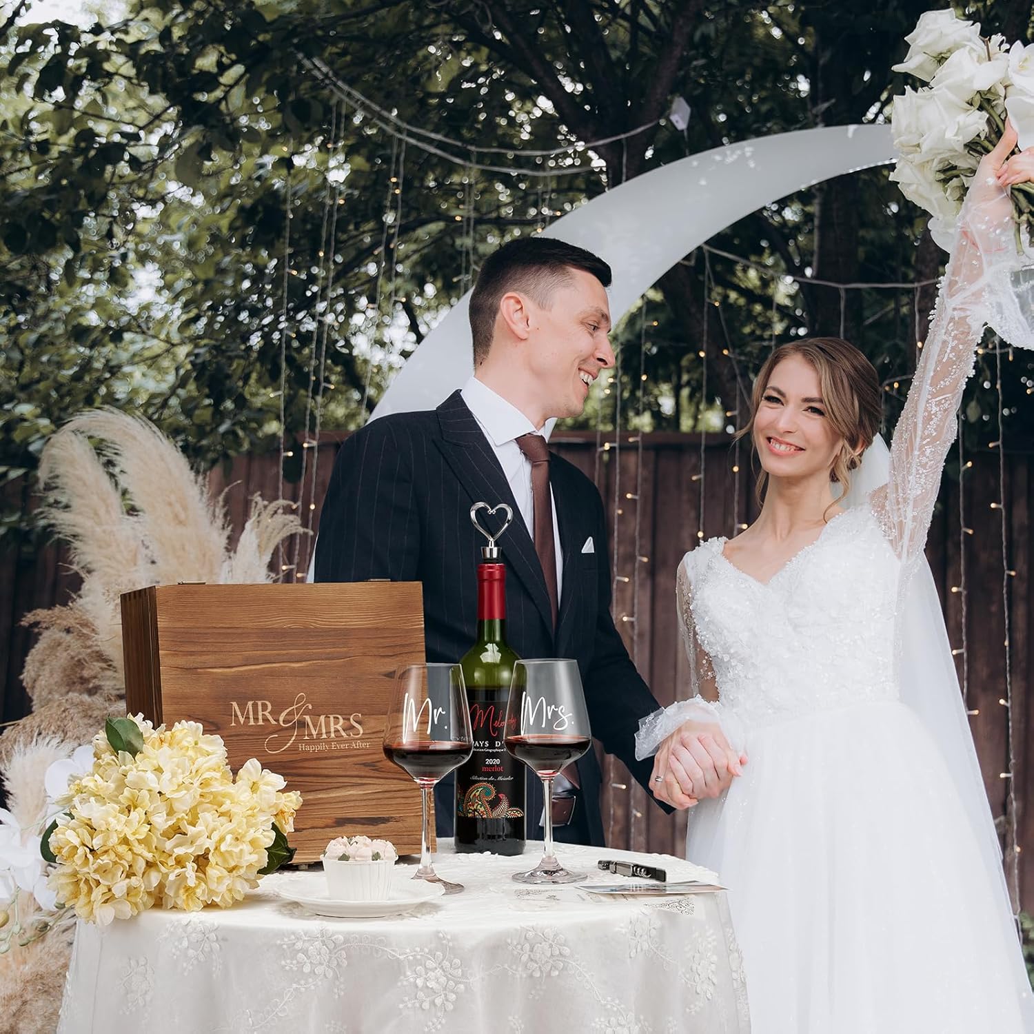 - Best Wine Gift Sets: Elevate every romantic milestone with our exquisite mr & mrs wine glasses set—2 wine glasses(12oz), 1* wine opener, 1* wine stopper, 1 * natural pine wood keepsake box (11×10.7×4.5 inches). A thoughtful present for couples toasts and beginning their journey