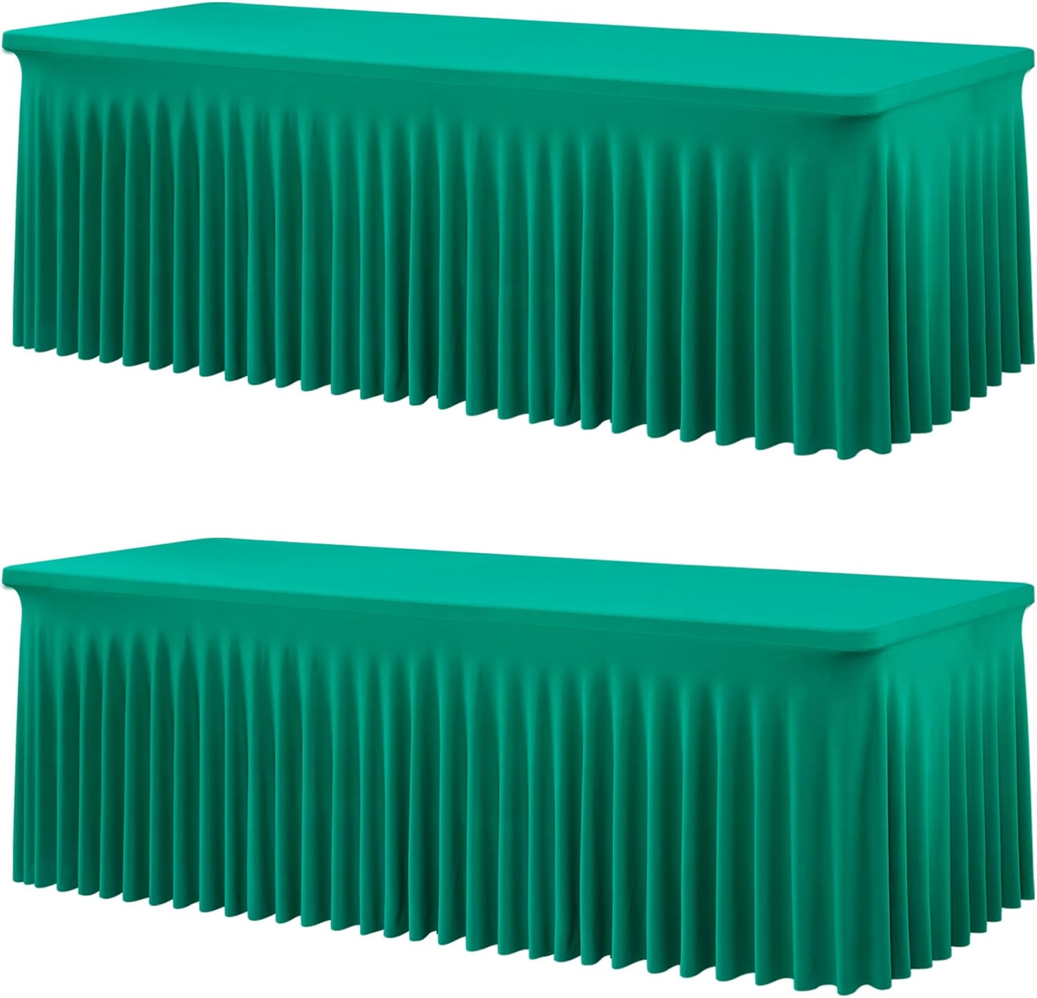 2 Pack Emerald Green Spandex Tablecloths for 8 Foot Rectangle Tables, Wrinkle Free Fitted Table Cloths Green 8ft Stretchy Table Cloth Cover with Skirt for Parties Weddings Birthday Banquet Baby Shower