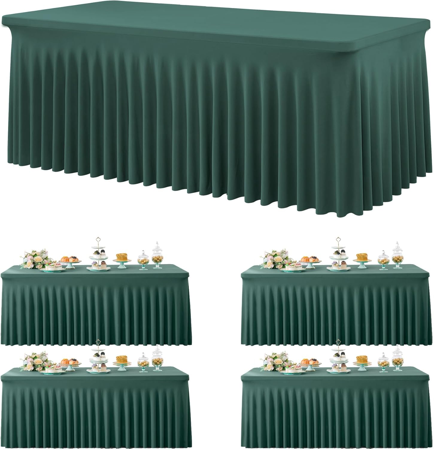 4 Pack Hunter Green Spandex Tablecloths for 8 Foot Rectangle Tables, Wrinkle Free Fitted Tablecover 8ft Stretchy Table Clothes with Skirt for Weddings Birthday Party Banquet Baby Shower