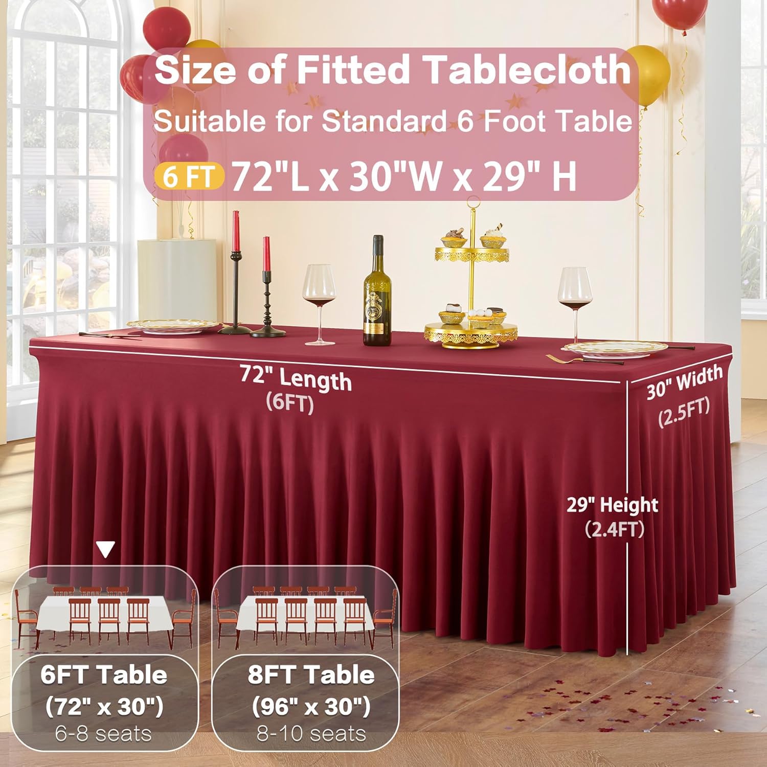 - 3. Fit for 6ft rectangle tables: Fitted table cover is good fit for a 72" Length x 30" Width x 30" Height table. No need to worry about the tablecloth blowing off or falling off.