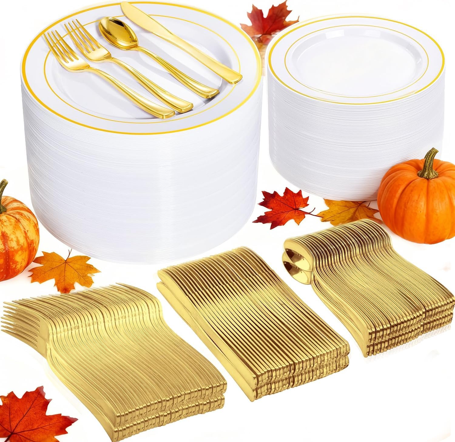 - ELEGANT DESIGN: Our gold disposable plates and gold utensils set are color-coordinated. The white plates with gold rim design gives this party plate an upscale, china-like look that will add a modern decorative touch to your table. Their elegant appearance can meet the aesthetic requirements of all people, and the gold plates can be used for any occasion.
