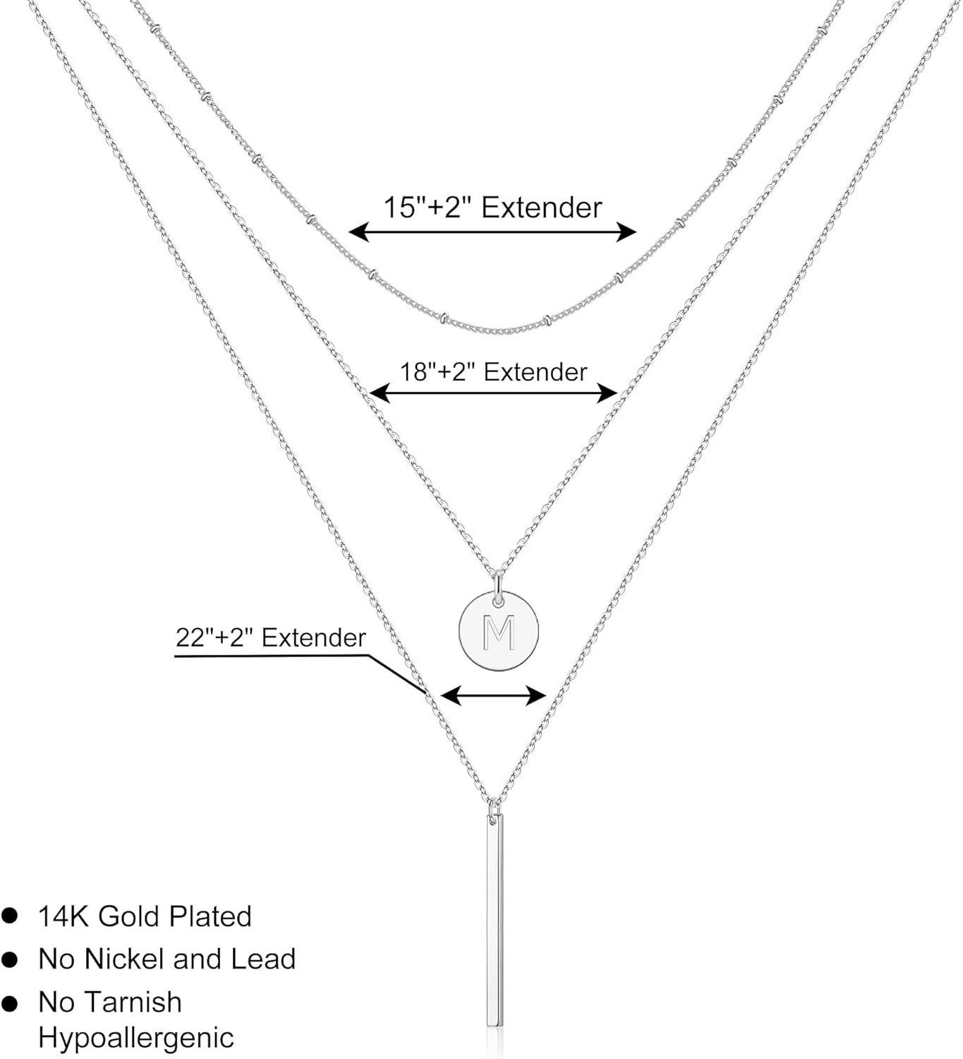 Initial Layered Necklaces for Women, 14K-Gold-Plated Coin Letter Necklace Bar Stacking Layer Necklace Multi Bar Layering Y-Necklaces Jewelry for Women