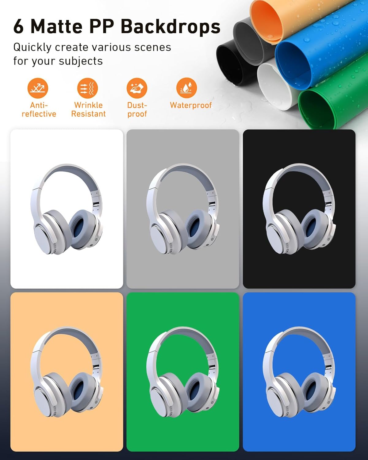 - 6 Matte Photography Backdrops: The lightbox kit comes with 6 high quality PP colour backgrounds (white, black, grey, light orange, blue and green) which are wrinkle resistant, dustproof, waterproof and easy to clean, more anti-reflective than PVC backgrounds, more durable than paper backgrounds. You can quickly build up a variety of scenarios to match different subjects and get colourful photos