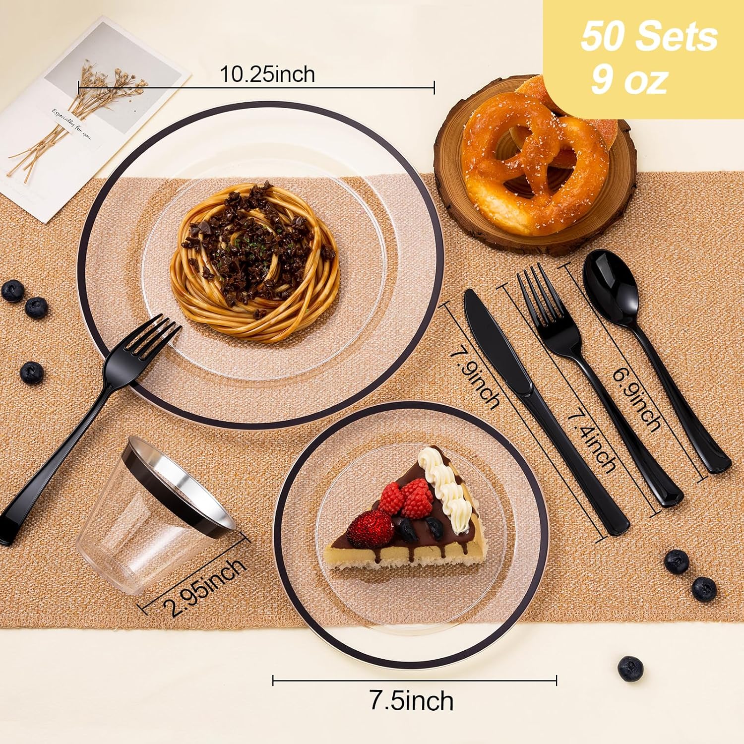 - 50 GUESTS PACK - Designed to serve 50 guests, this black party plates set comprises 50 transparent black plastic dinner plates, 50 salad dessert plates, 50 9-ounce clear fancy disposable cups with black rims, and a disposable plastic silverware set comprising 50 knives, 100 forks, and 50 spoons.