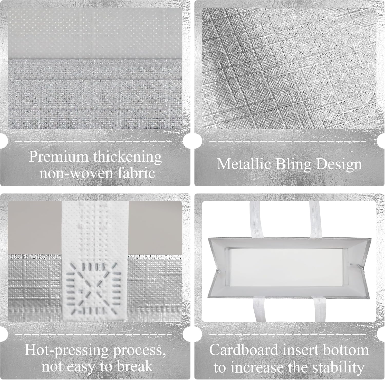 - Reinforced Base Design: Each non-woven gift bags bulk with a 12.6 x 4.7 inches (32 x 12 cm) sturdy cardboard design, which provides extra support for added strength and durability. What's more, the non-woven gift bags with handles is less likely to wear out or deform when carrying or placed items for daily life, prolonging the life of the silver goodie bags for party.