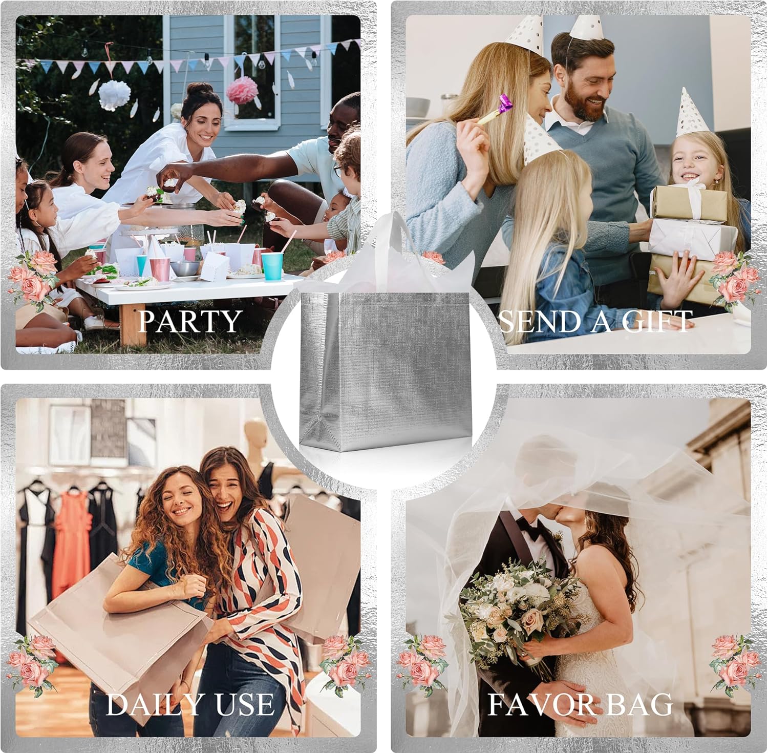- Widely Used: Our metallic bling gift bags for present are the perfect combination of versatility and elegance, which the rich silver color and exquisite embossed design are eye-catching. Glossy holiday gift bags with handles are perfect for any occasion, such as wedding gift bags, bridesmaid gift bags, party favor bags, birthday gift bags, graduation gift Bags, Christmas gift bags, and more.