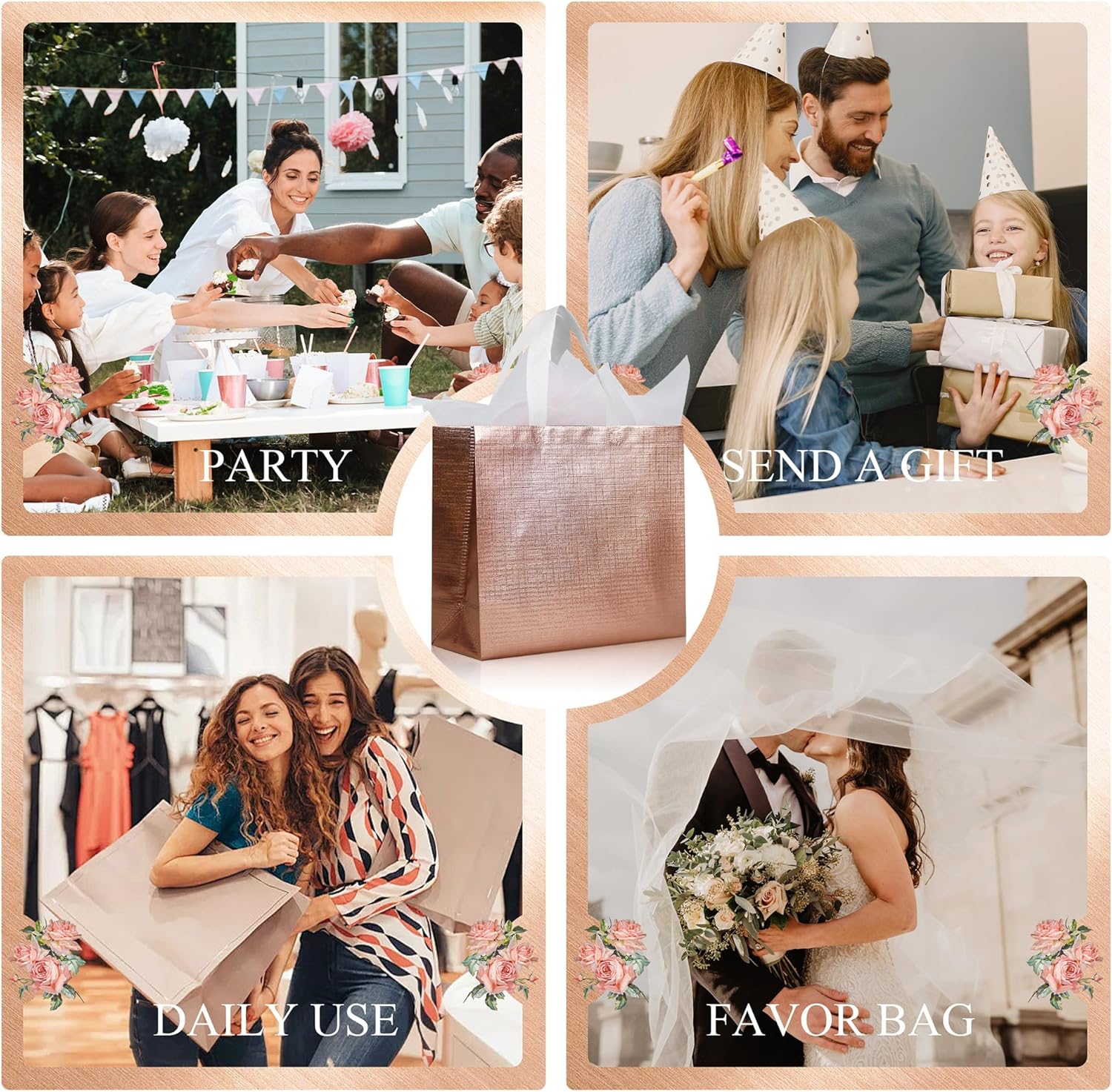 - Reinforced Base Design: Each non-woven gift bags bulk with a 12.6 x 4.7 inches (32 x 12 cm) sturdy cardboard design, which provides extra support for added strength and durability. What's more, the non-woven gift bags with handles is less likely to wear out or deform when carrying or placed items for daily life, prolonging the life of the rose gold goodie bags for party.