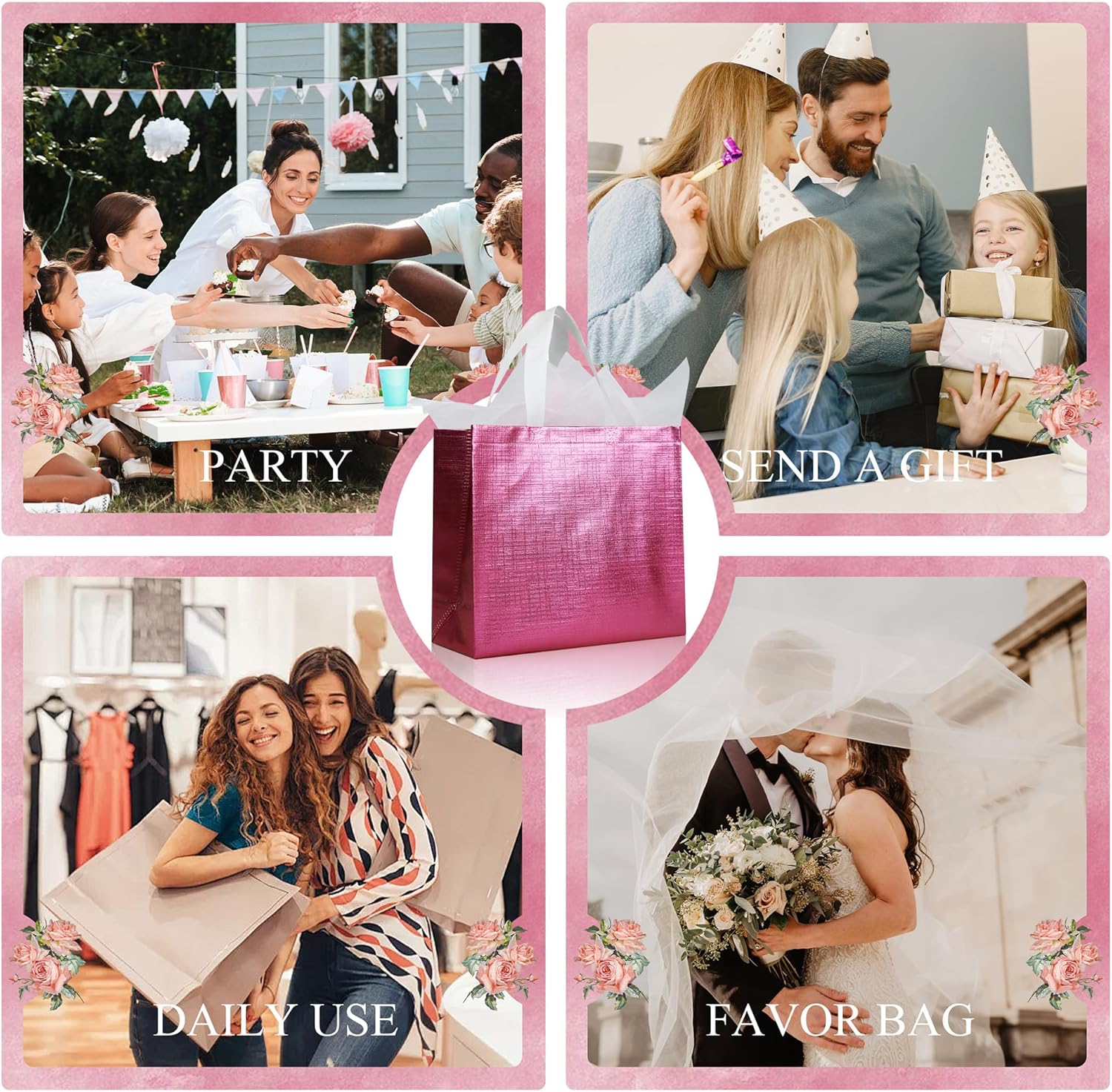 - Widely Used: Our pink metallic bling gift bags for present are the perfect combination of versatility and elegance, which the rich pink color and exquisite embossed design are eye-catching. Glossy holiday gift bags with handles are perfect for any occasion, such as wedding gift bags, bridesmaid gift bags, party favor bags, birthday gift bags, graduation gift Bags, Christmas gift bags, and more.