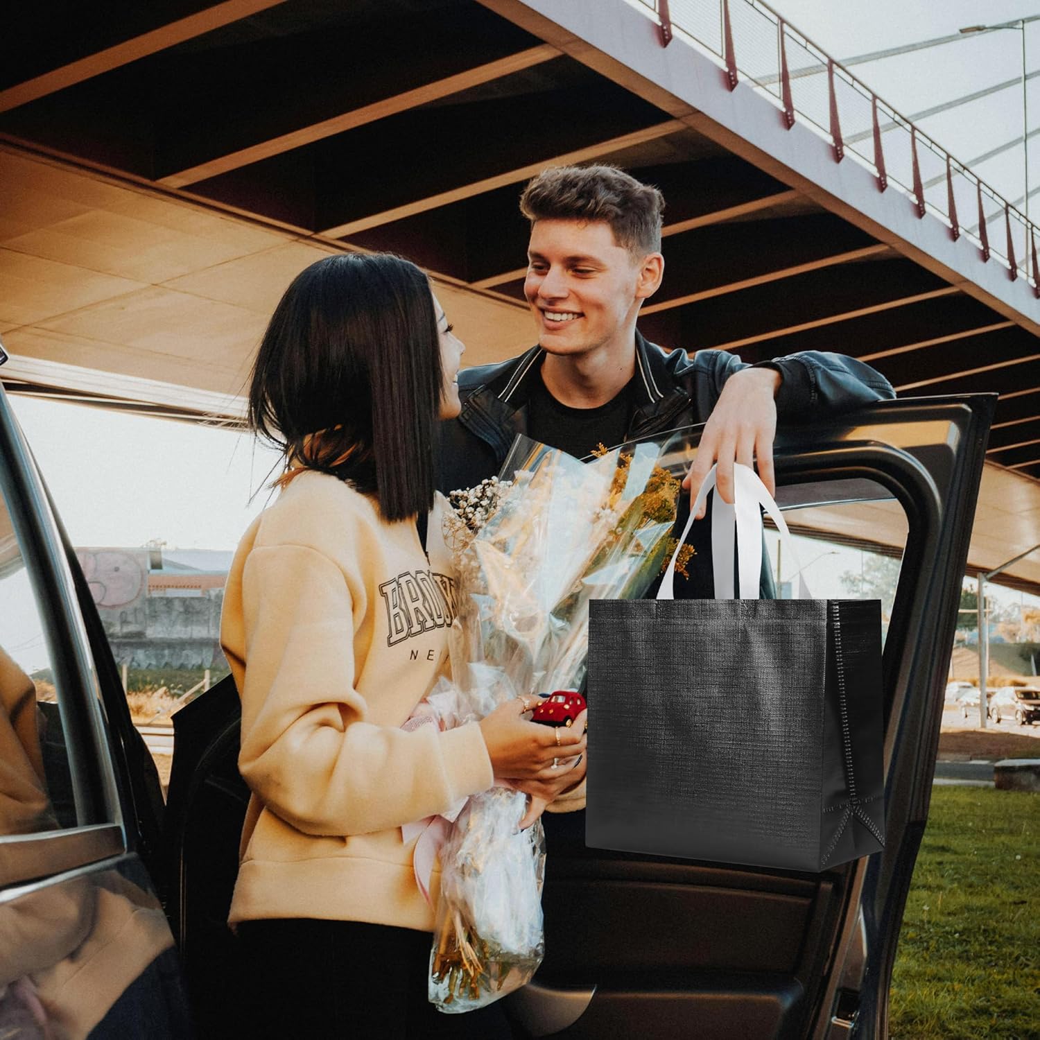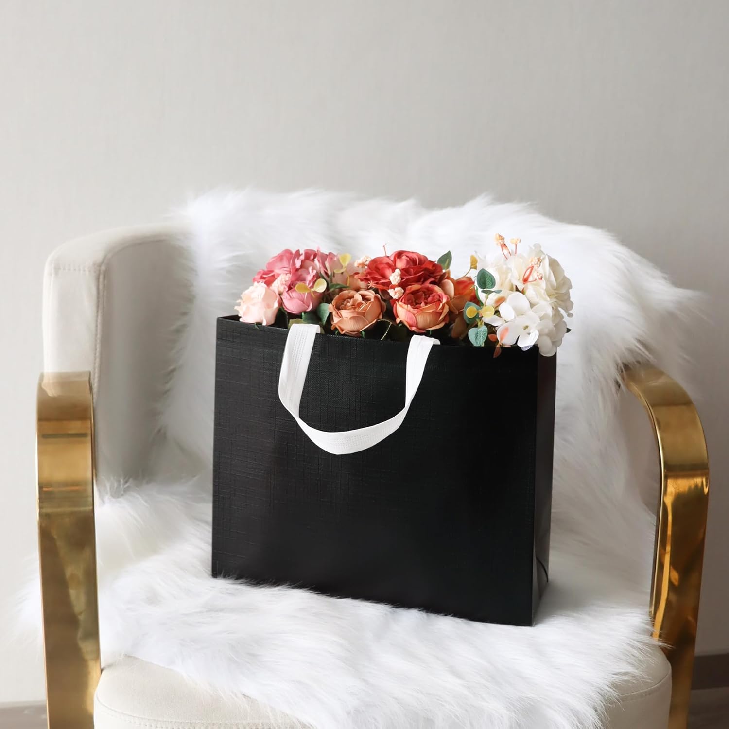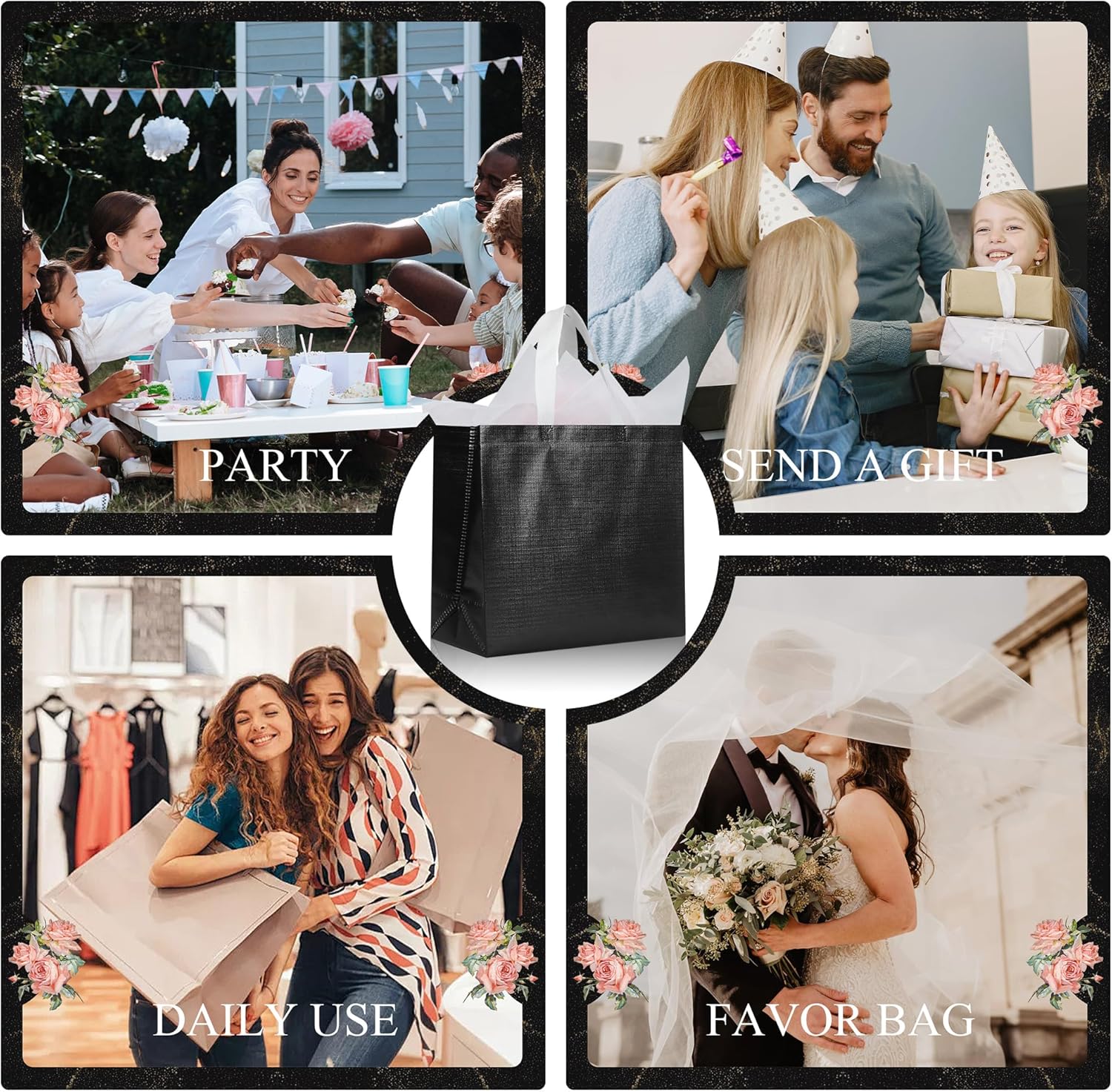 - Reinforced Base Design: Each non-woven gift bags bulk with a 12.6 x 4.7 inches (32 x 12 cm) sturdy cardboard design, which provides extra support for added strength and durability. What's more, the non-woven gift bags with handles is less likely to wear out or deform when carrying or placed items for daily life, prolonging the life of the black goodie bags for party.