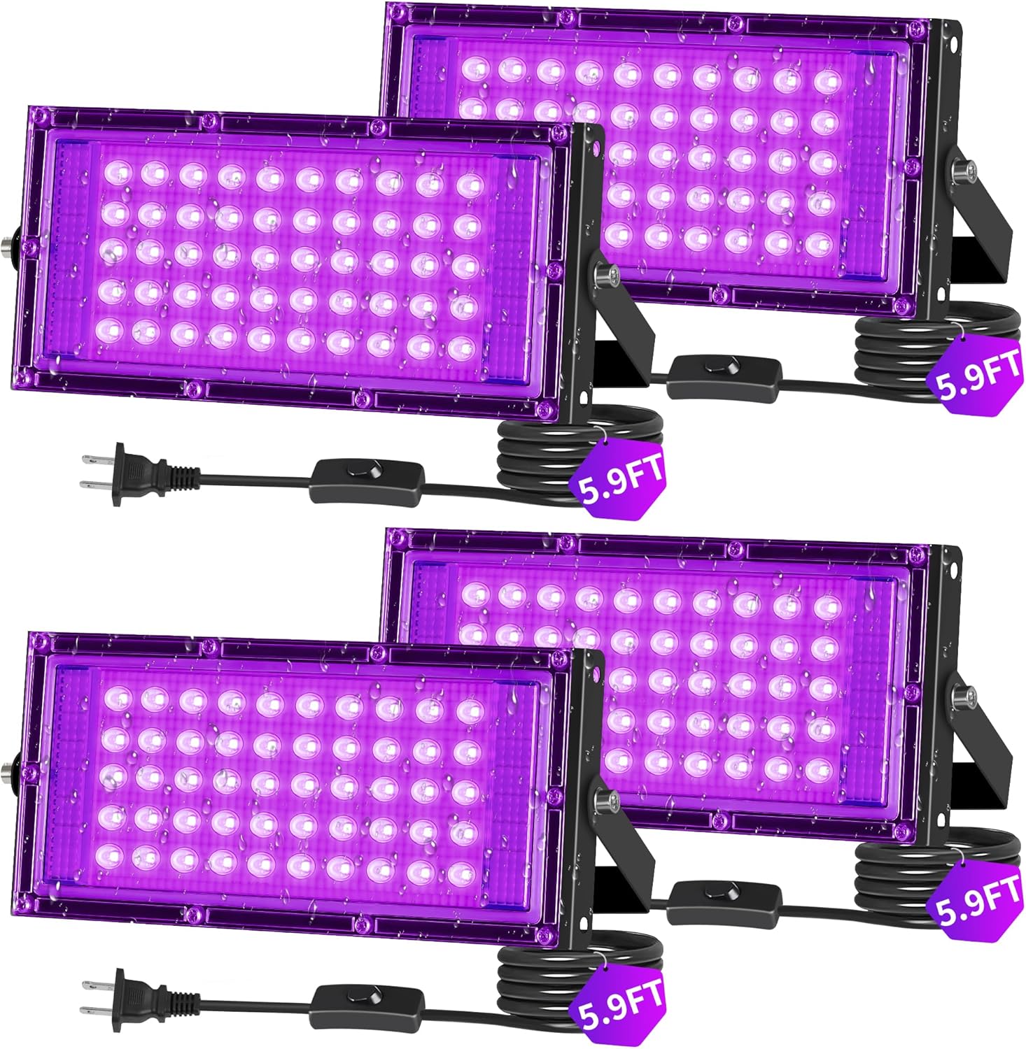 50W LED Black Lights IP66 Waterproof Black Light Outdoor with 5.9ft Plug+Switch, Flood Blacklight for Halloween Glow in The Dark Party Stage Light Neon Glow Birthday 4 Pack