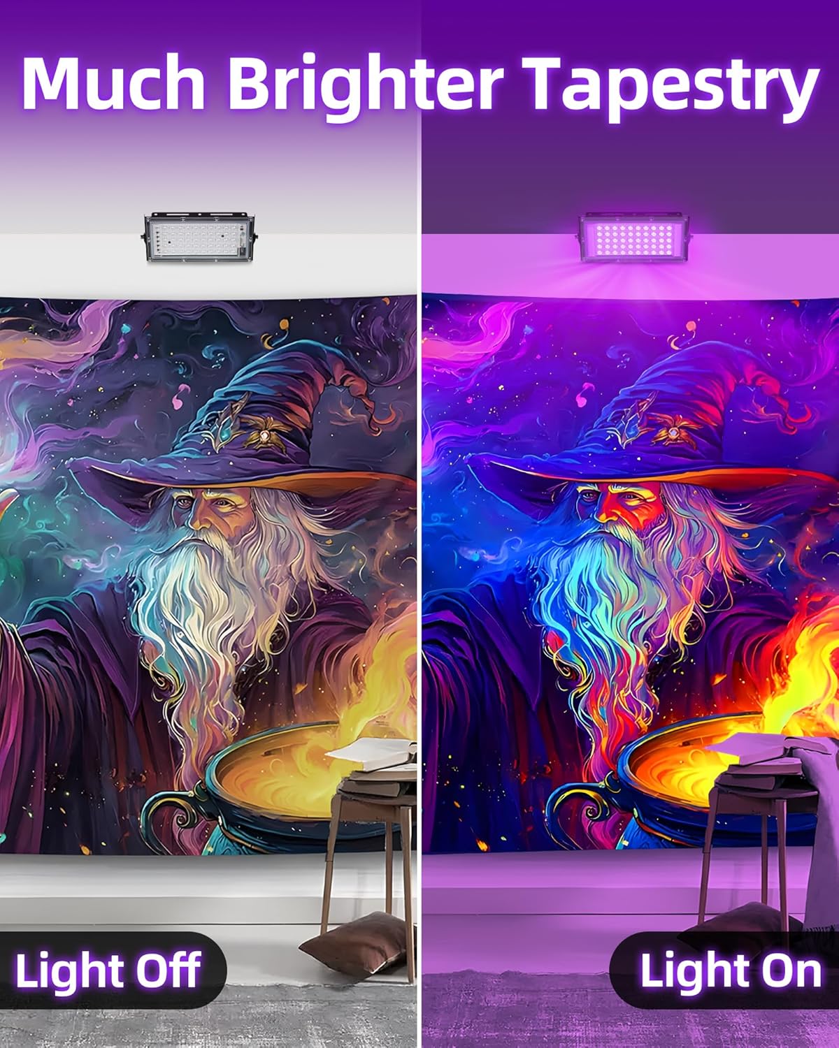 - POWERFUL OUTDOOR BLACK LIGHTS: Each 50W black light comes with 50 high quality LED beads and has a 120 degree beam angle that can illuminate up to 592 SQ.FT. In addition, you can adjust it to the desired direction using the 360° adjustable bracket. The black lights for glow party large space are suitable for living rooms, yards, and more. Have a cool glow party