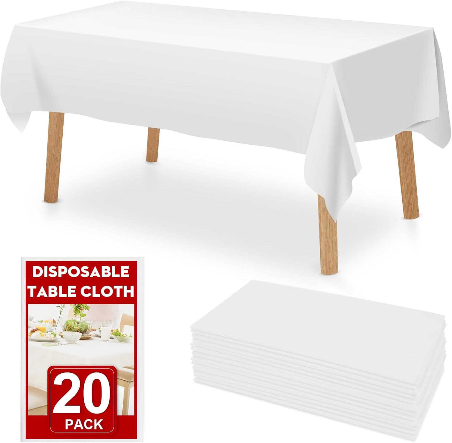 - VARIETY OF CHOICES: Our selection includes 20 pack white disposable plastic tablecloths to prevent stains from spilling onto the table and make your dining experience more enjoyable