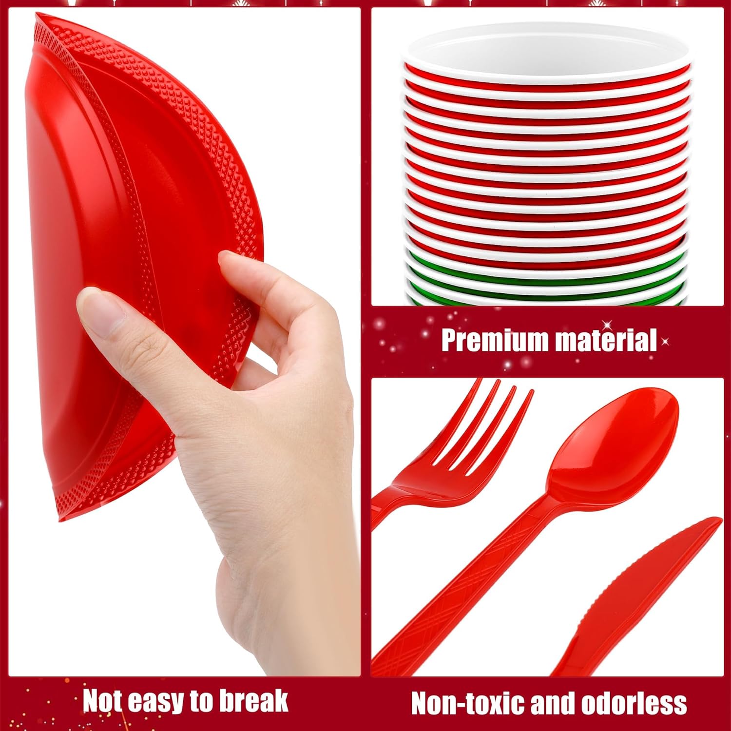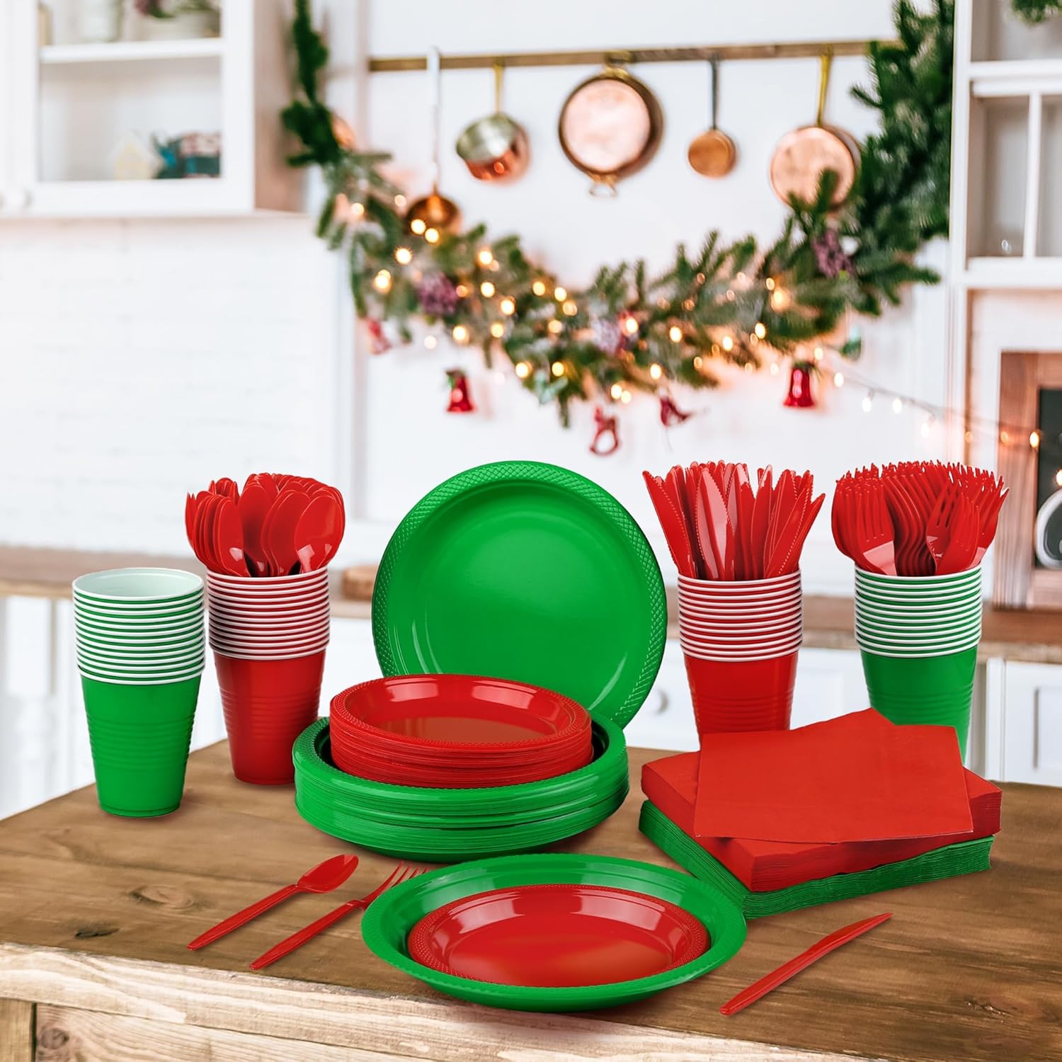 Aodaer 400 Pieces Christmas Party Supplies Red Green Plastic Dinnerware Include Plates Cups Knives Forks Spoons Paper Napkins for Christmas Birthday Wedding Parties, Serve 50 Guests
