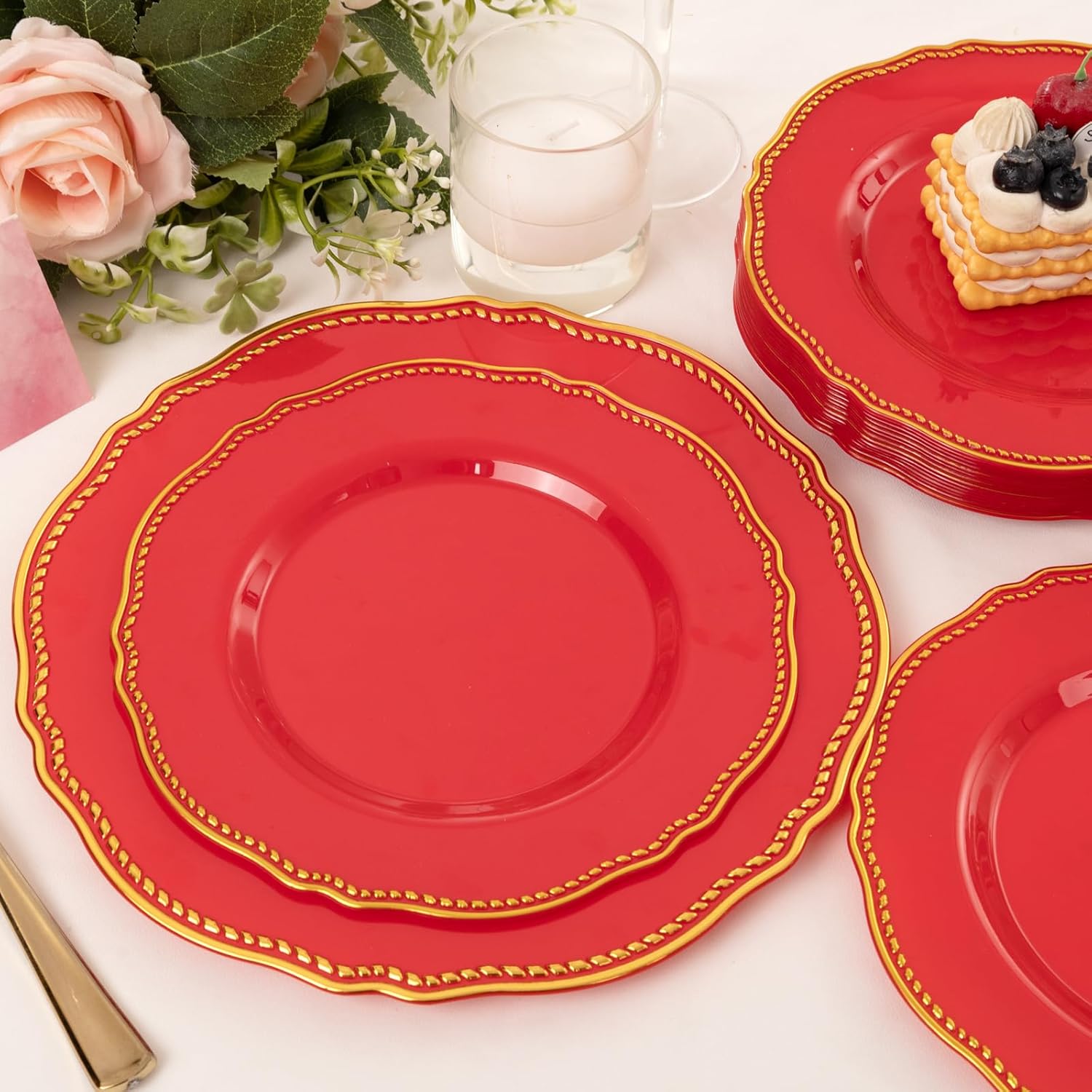 - Perfect For Any Occasions - The red and gold dessert plates are our latest round shapes design for holiday party, With these disposable appetizer plates, you can easily host a party without worrying about the cleanup at the end, just throw them in the trash after use. These plastic party plates are perfect for wedding, Christmas, holidays, Thanksgiving dinners and any other occasions