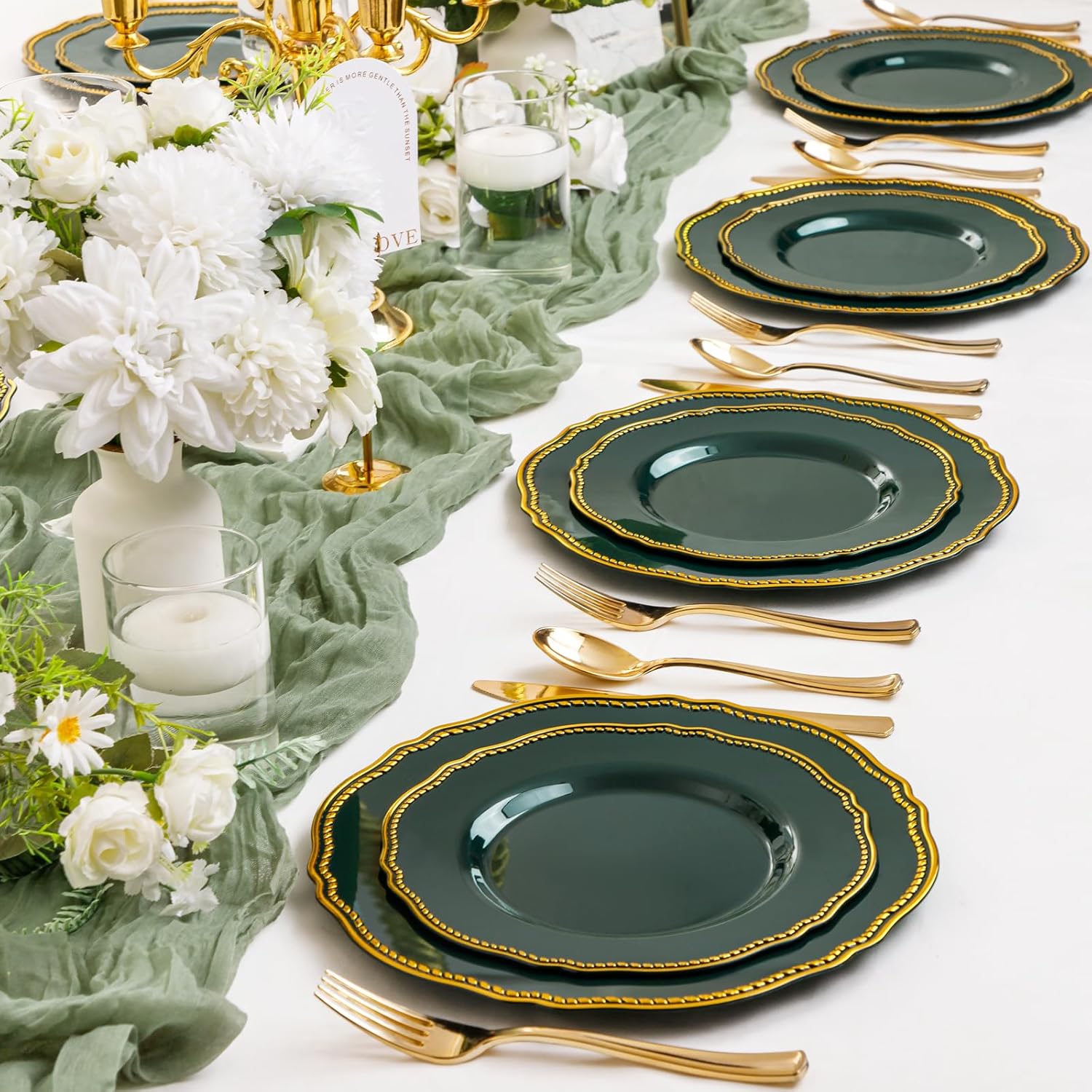 - Perfect For Any Occasions - The green plates with gold rim are our latest round shapes design for holiday party, With these green disposable plates, you can easily host a party without worrying about the cleanup at the end, just throw them in the trash after use. These plastic party plates are perfect for wedding, Christmas, holidays, Thanksgiving dinners and any other occasions
