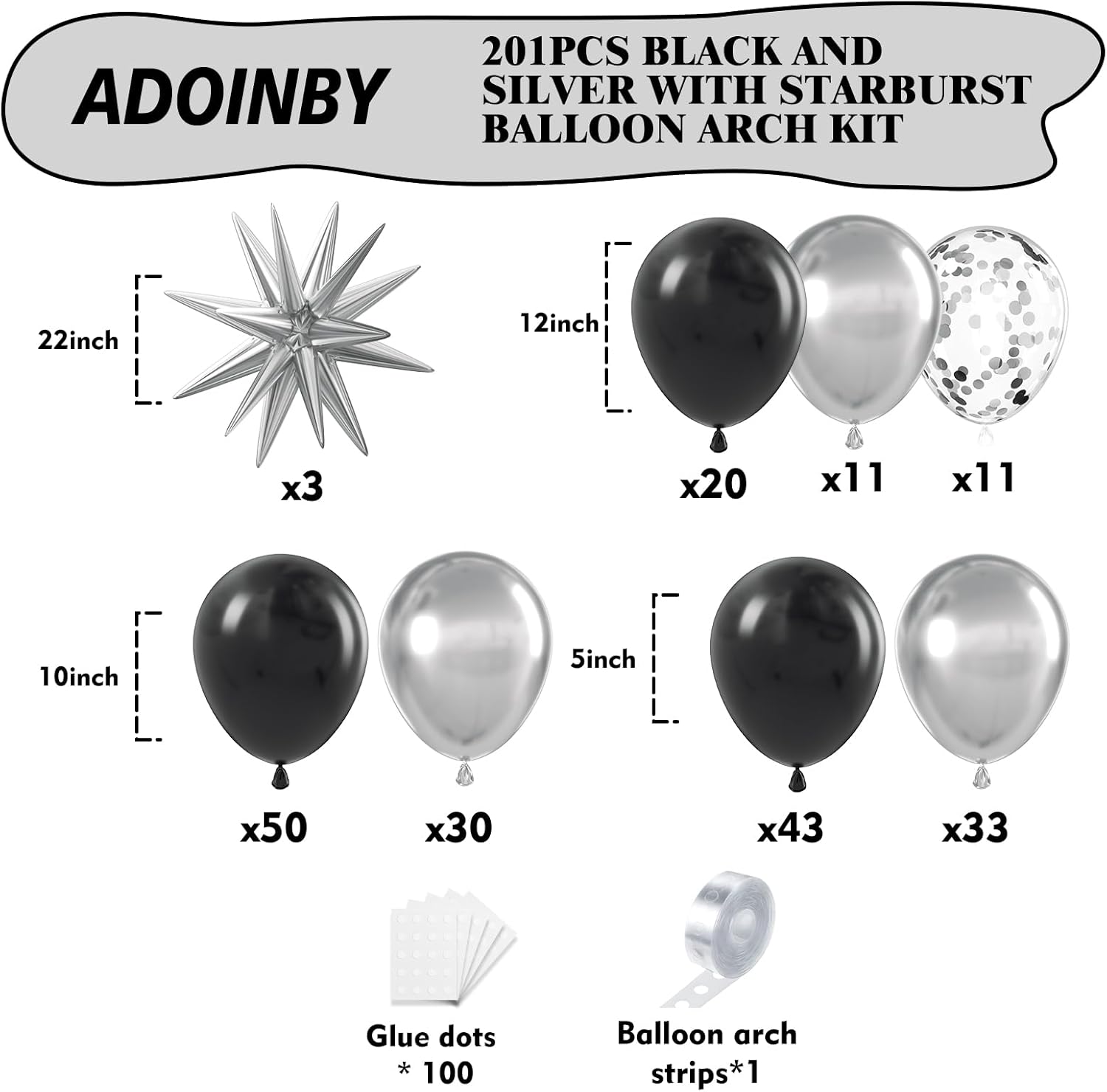 - BALLOON GARLAND ARCH KIT PACKAGE: 201pcs balloons Include 22''(Silver explosion star balloons 3pcs), 12''(Black balloons 20pcs, Silver balloons 11pcs, Silver confetti balloons 11pcs),10''(Black balloons 50pcs, Silver balloons 30pcs), 5''(Black balloons 30pcs, Silver balloons 33pcs, White balloon 10pcs, Silver balloons 17pcs),16FT garland strip x1,100 dots glue