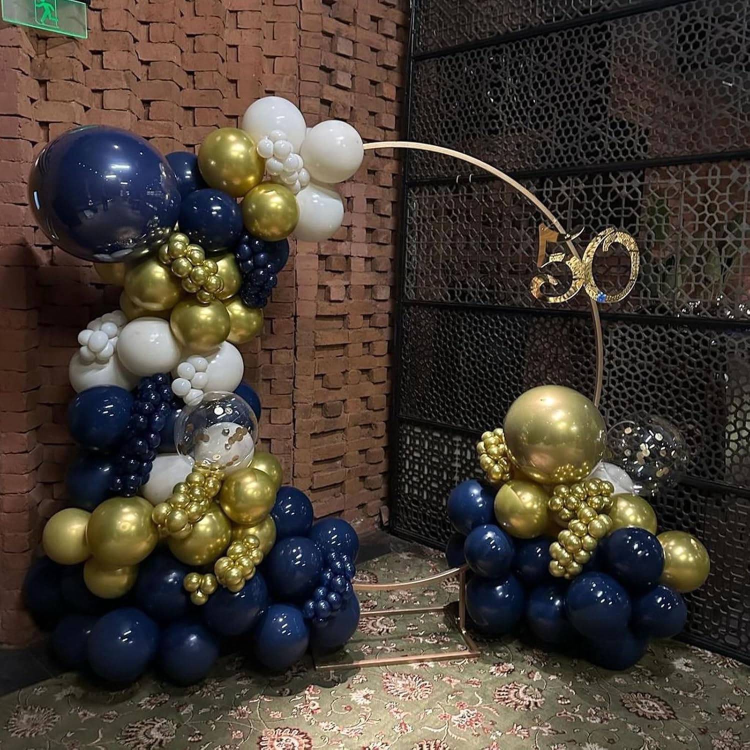 - BALLOON GARLAND ARCH KIT PACKAGE: 188pcs balloons Include 12''(Navy blue balloons 10pcs, Metallic gold balloons 10pcs, White Balloons 8pcs, Gold confetti balloons 11pcs),10''(Navy blue balloons 30pcs, Metallic gold balloons 30pcs, White balloon 20pcs, Gold Star balloons 10pcs), 5''(Navy blue balloons 22pcs, Metallic gold balloons 22pcs, White balloon 15pcs),16FT garland strip x1,100 dots glue
