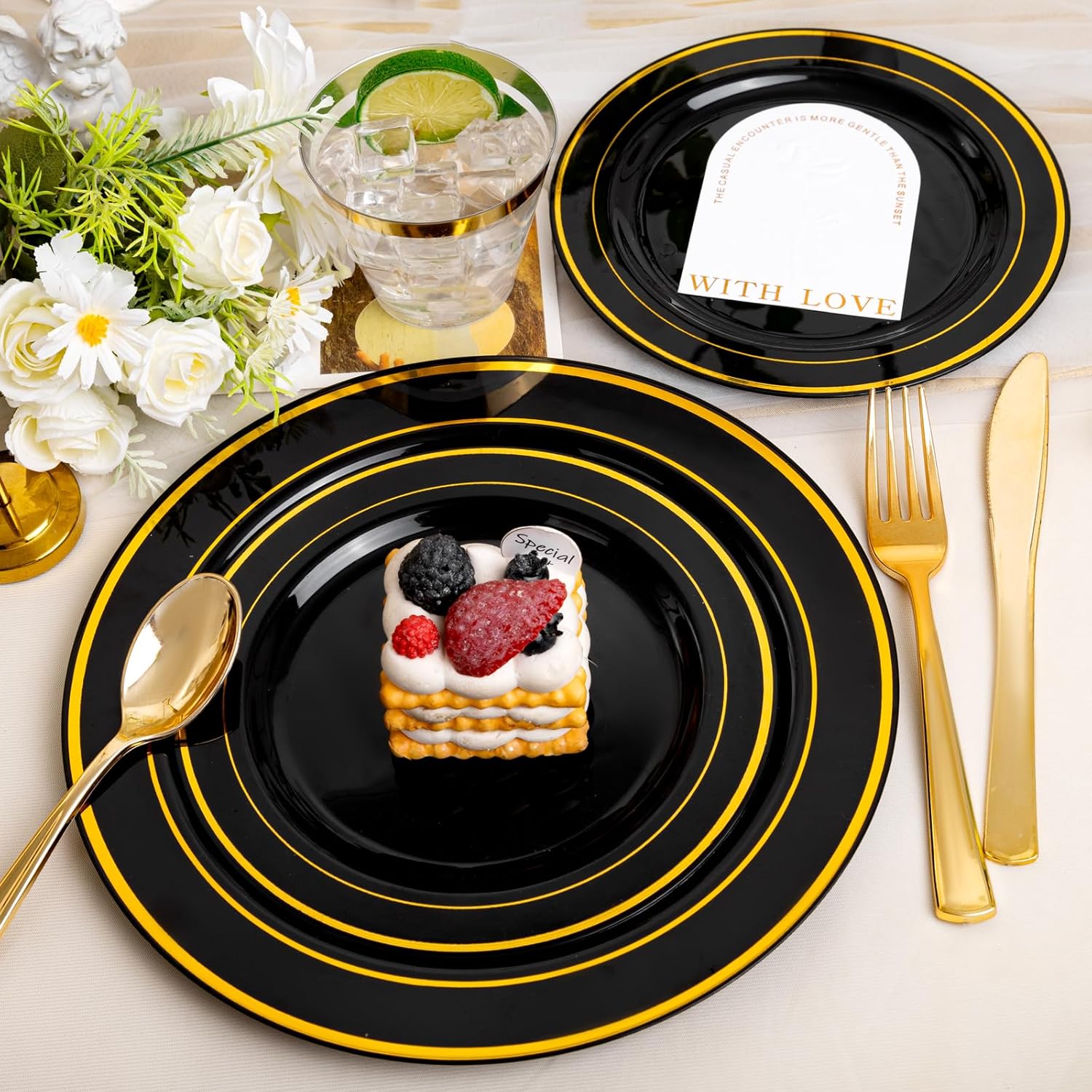 - CONVENIENT: Our black gold plastic disposable dinnerware set are sufficient and sturdy, you can use them with confidence