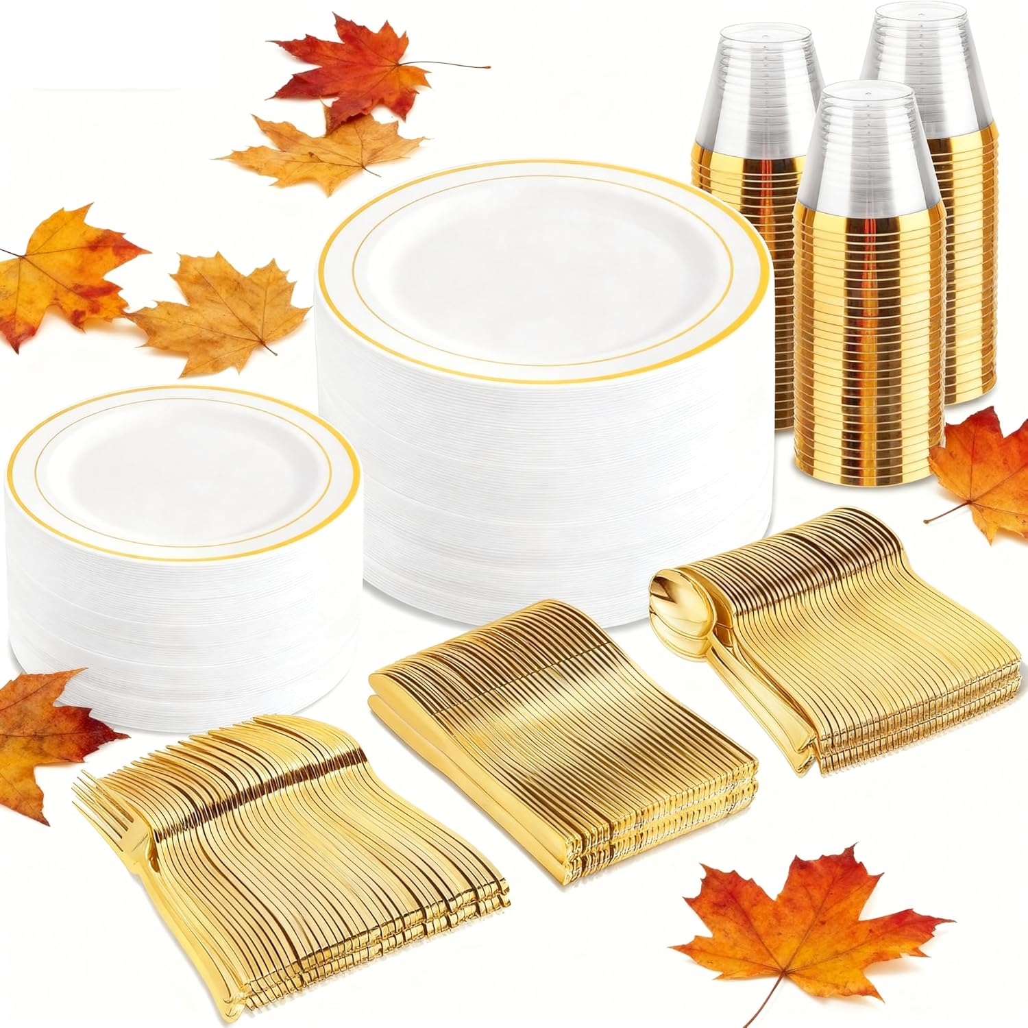 - CONVENIENT AND FAST: We have already matched the tableware you need for your event, and you only need to set out these Thanksgiving white and gold plates. The disposable design allows you to quickly dispose of these gold disposable party dinnerware set after the event
