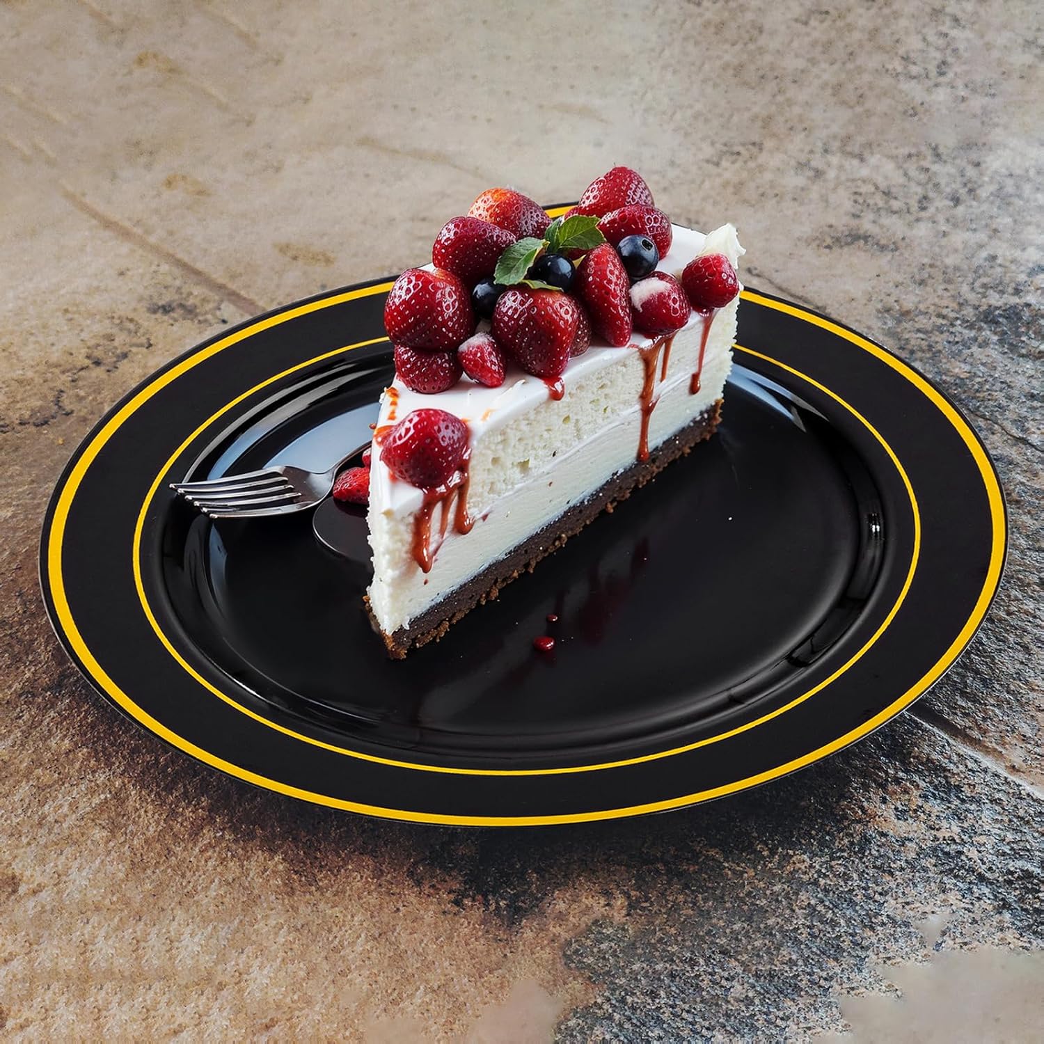 bUCLA 100PCS Black and Gold Plastic Plates - 6.25 inch Black Gold Premium Hard Disposable Dessert/Salad/Appetizer/Small Cake Plates for Party, Graduation & New year