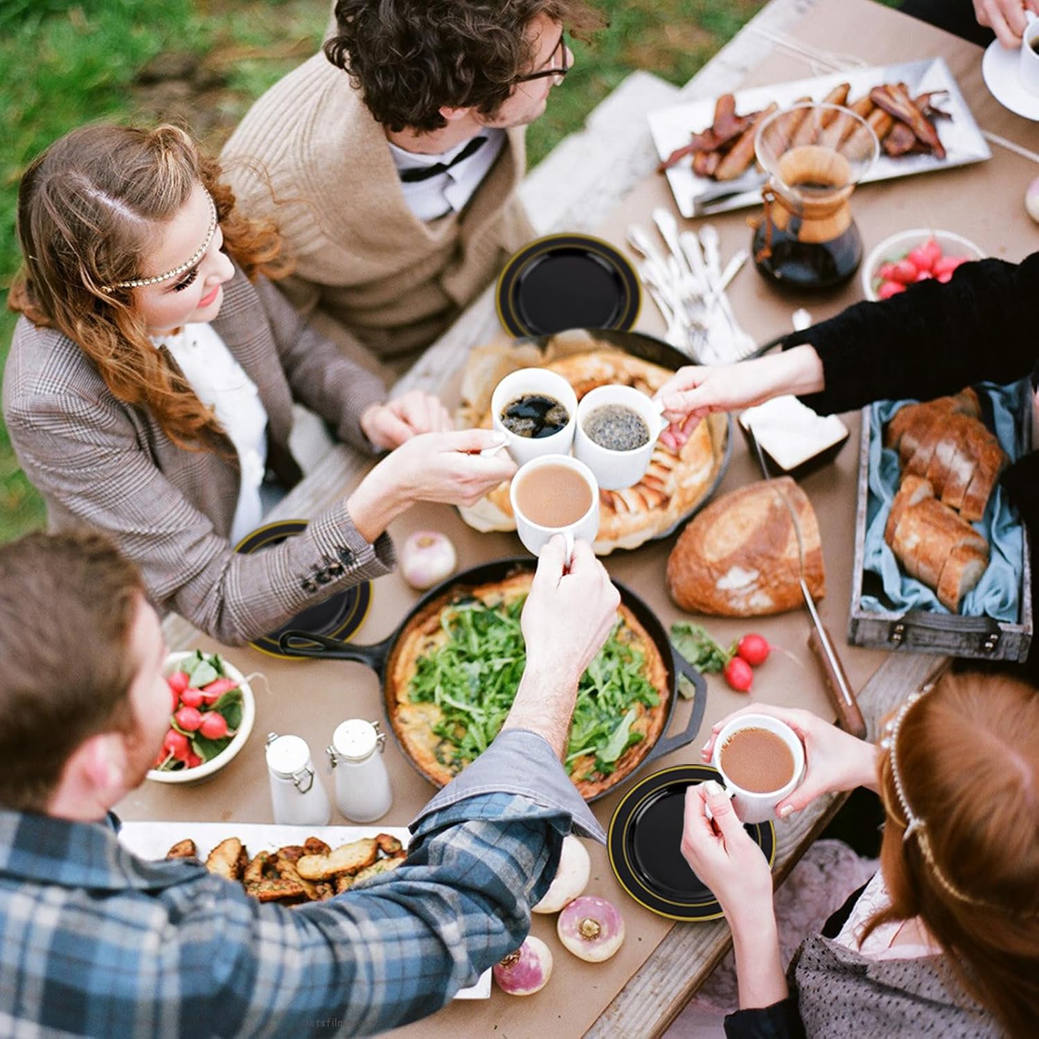 - UNIQUE DESIGN: These black plastic plates have gold trim design. These black and gold plates add a mysterious color to your party, which will impress you and your guests.